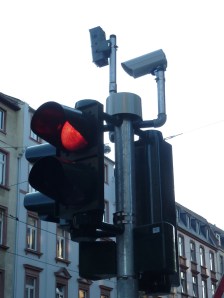 Diese Ampelanlage steht nicht in der Nähe des Kanzleramtes, der amerikanischen Botschaft oder sonst einem gefährdetem Objekt. Nein, diese Ampelanlage mit der Überwachungskamera wurde unlängst an einem Fußgängerüberweg in Frankfurt Bornheim, Saalburgstraße / Berger Straße, installiert. Was läßt sich da überwachen? Die Bornheimer, die mittwochs oder samstags mit vollen Einkaufstaschen vom Wochenmarkt zurückkehren, oder die Ausgeh- und Amüsierwilligen, die in die Bars, Cafes, Apfelweinwirtschaften und Restaurants der oberen Berger Straße strömen. Wird man jetzt gefilmt, wenn man bei Rot die Straße kreuzt, während Kinder mit ihren Eltern darauf warten, dass die Ampel auf Grün schaltet. Obwohl man das besser unterläßt, lautstarke Verfluchungen seitens empörter Passanten sind einem im Sündenfall sicher. Vielleicht soll auch die Revolution überwacht werden, die dort gelegentlich ihren alten Hanomag parkt und die Ladefläche nutzt um klassenkämpferische Parolen zu skandieren. In englischen Städten wurden nach den kürzlich ausgebrochenen Krawallen Fotos von Beteiligten an öffentliche Monitorpranger gestellt. Diese Bilder wurden von Überwachungskameras im öffentlichen Raum aufgenommen. Erwartet man dergleichen auch in Frankfurt und will vorbereitet sein? Auszuschliessen ist, dass die Überwachungsanlage dazu dient, Autofahrer zu ermitteln, die trotz roter Ampel den Fußgängerübergang kreuzen (ein in Frankfurt recht weit verbreitetes Autofahrervergnügen). Dazu hätte die Obrigkeit eine Blitzanlage installieren müssen. Die freilich gibt es dort nicht.