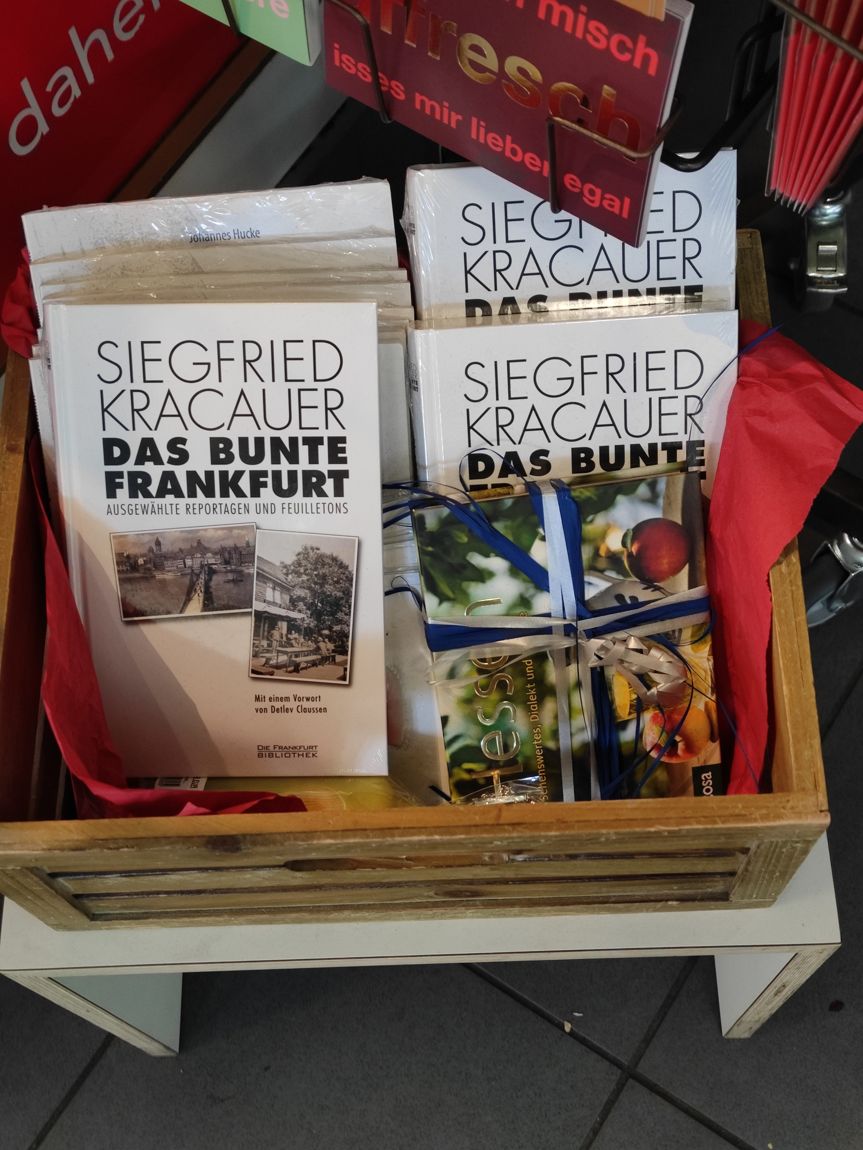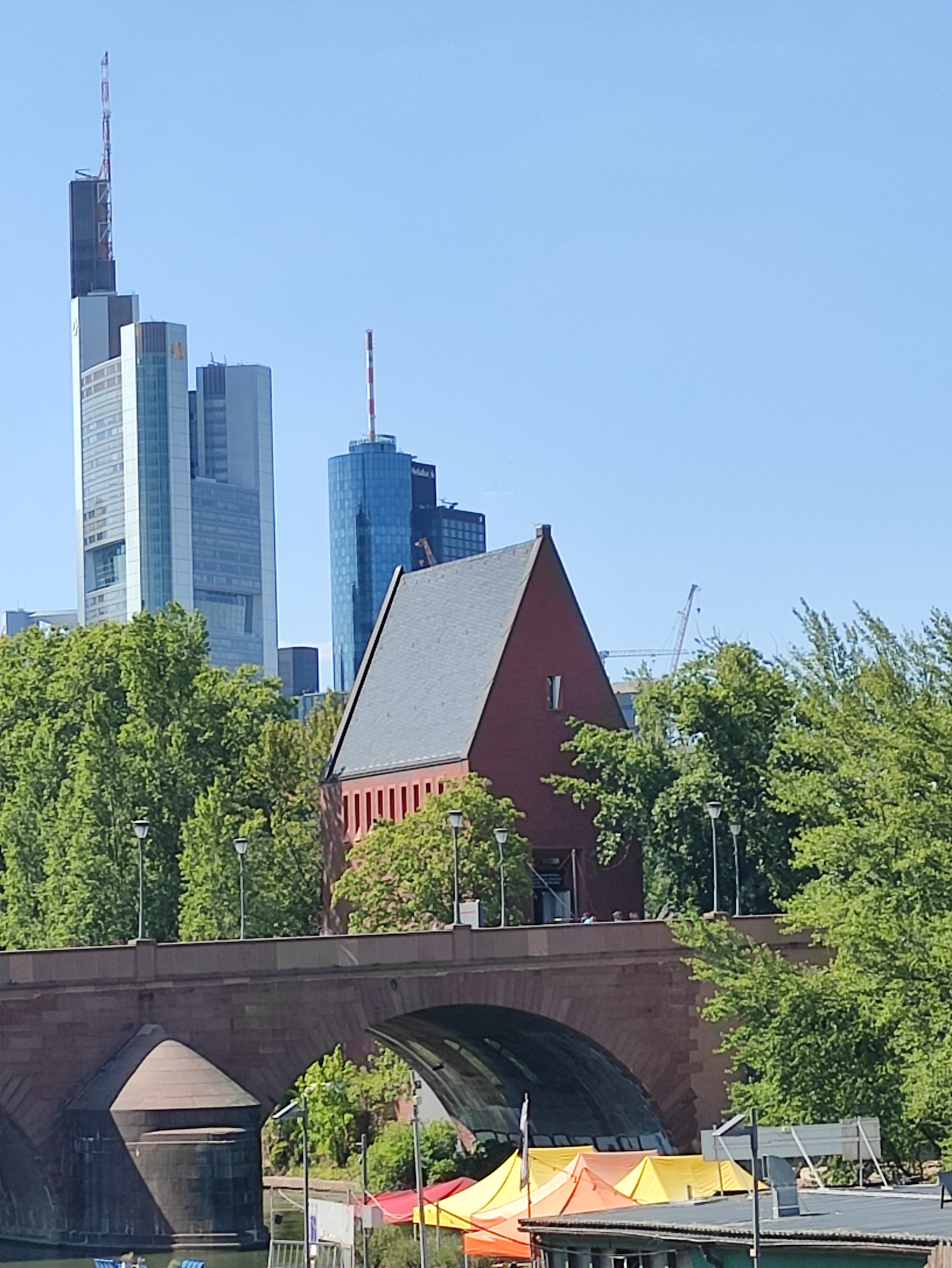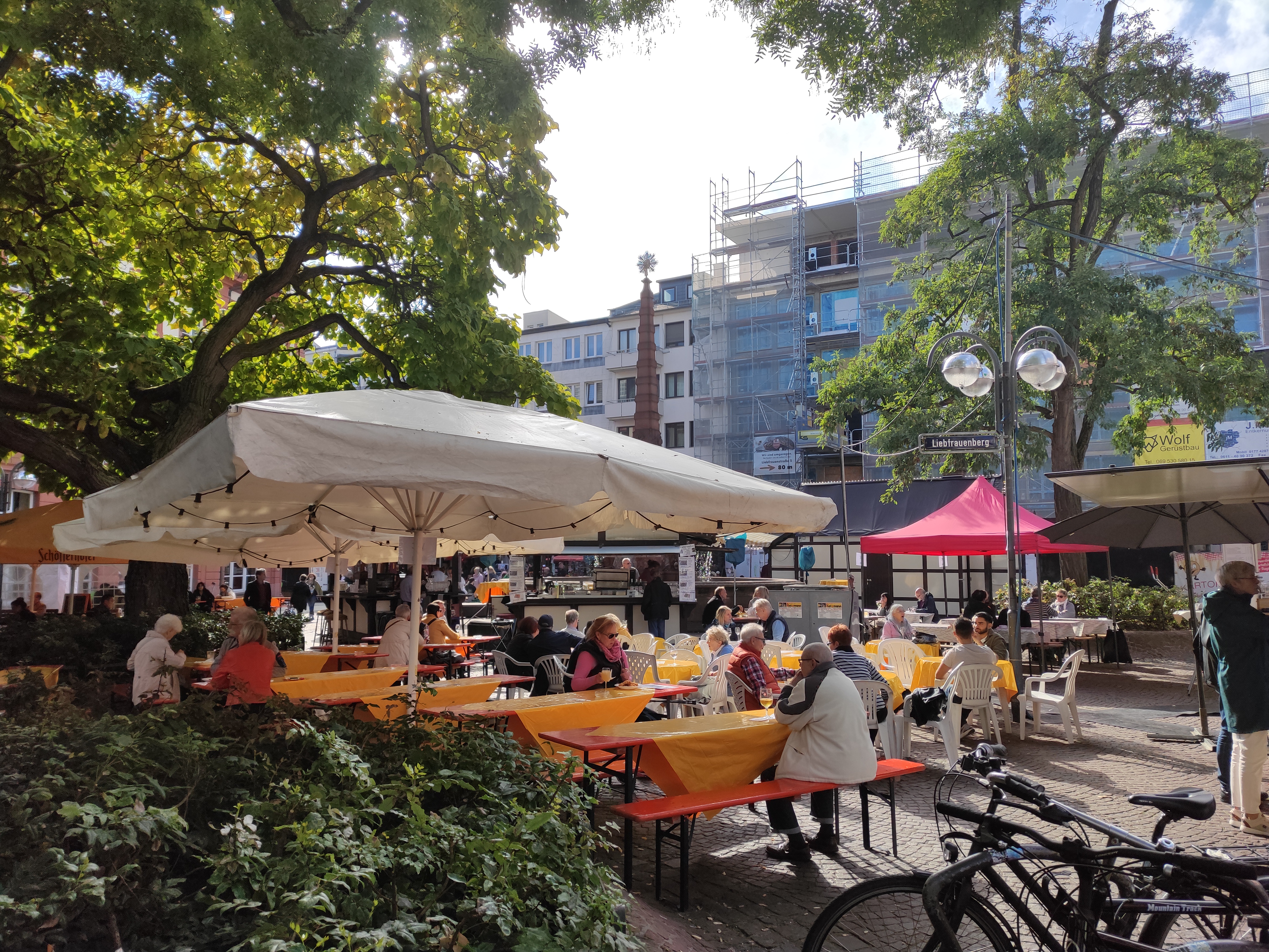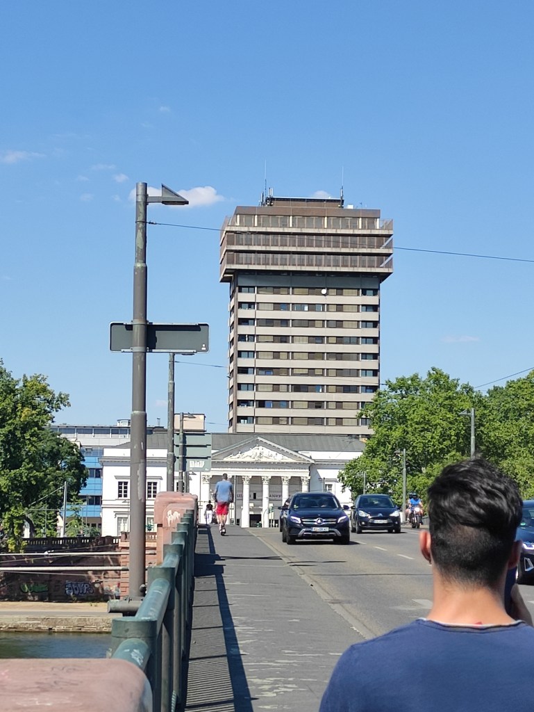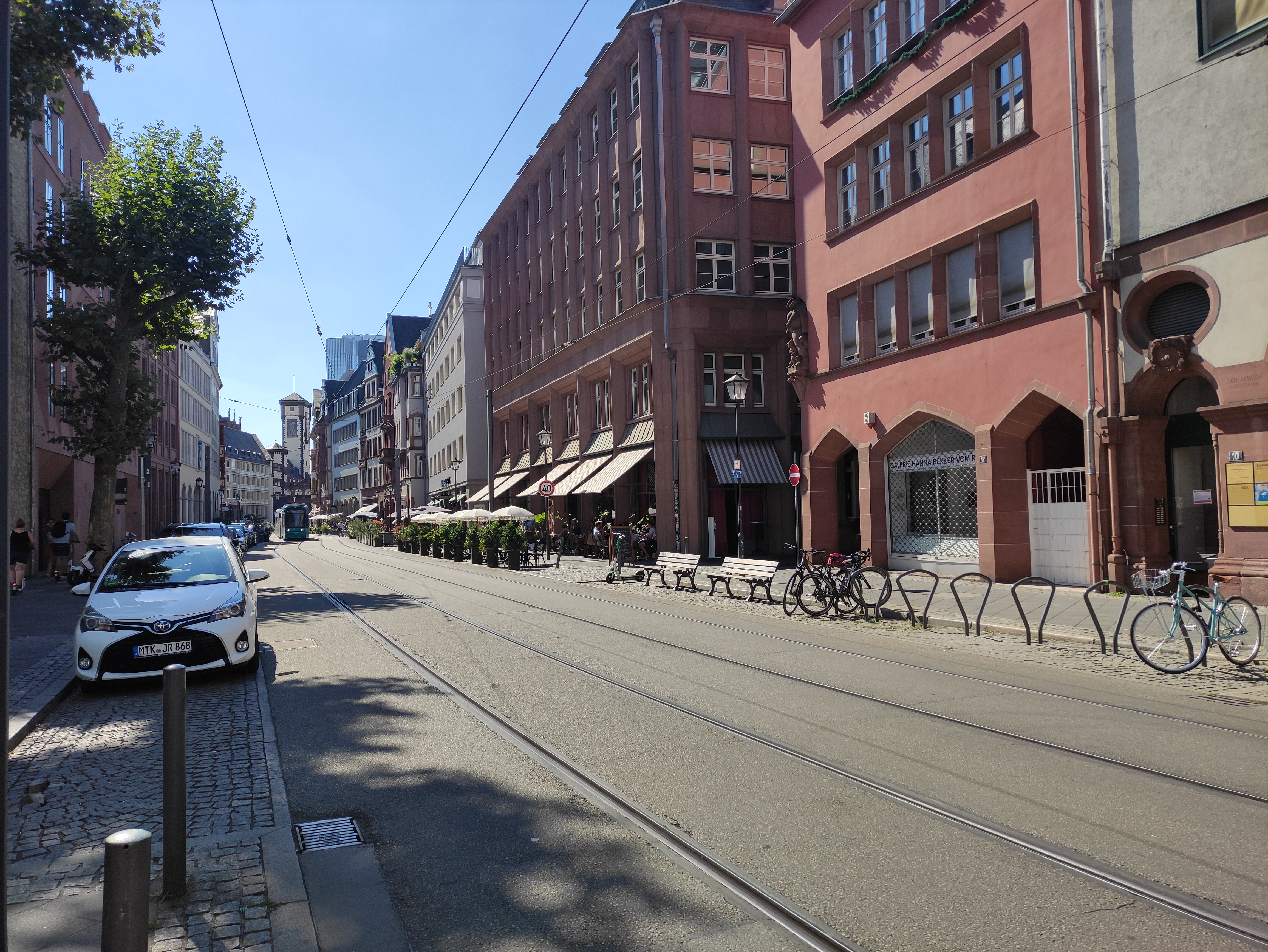 Gestärkt ging es zurück über den Bockenheimer Campus. An der Senckenberganlage die legendäre Adorno-Ampel. Der berühmte Philosoph und Soziologe soll gesagt haben, wenn die Studenten da sind wo sie sein sollen, nämlich in Gedanken, dann müsse dort eine Ampel hin. Adorno wurde der Wunsch erfüllt. Niemand weiß, wieviel gedankenversunkenen Studentinnen und Studenten dadurch das Leben gerettet wurde. Weiter durch vertrautes Terrain, den Kettenhofweg, mittlerweile zur Fahrradstraße umgestaltet. Früher mein Arbeitsweg zum Suhrkamp Verlag in der Lindenstraße. Da Adorno schon erwähnt wurde, in dieser Straße hat er mit seiner Frau Gretel gewohnt. Vom ursprünglichen Plan zur Kleinmarkthalle zu gehen, um diverse Zutaten für Harissa zu besorgen, bin ich abgekommen. Die Beine waren zu schwer. Statt dessen auf dem Markt an der Schillerstraße einen Riesling getrunken. Für mich der Abschluss des kleinen Ausflugs, der mir wieder mehr von der Stadt gezeigt hat, in der ich schon seit über zwanzig Jahren lebe. Der Heimweg nach Bornheim ist Routine und nicht der Rede wert. Zuhause hatte ich 23000 Schritte und 17 km in den Beinen und fühlte mich lebendig.