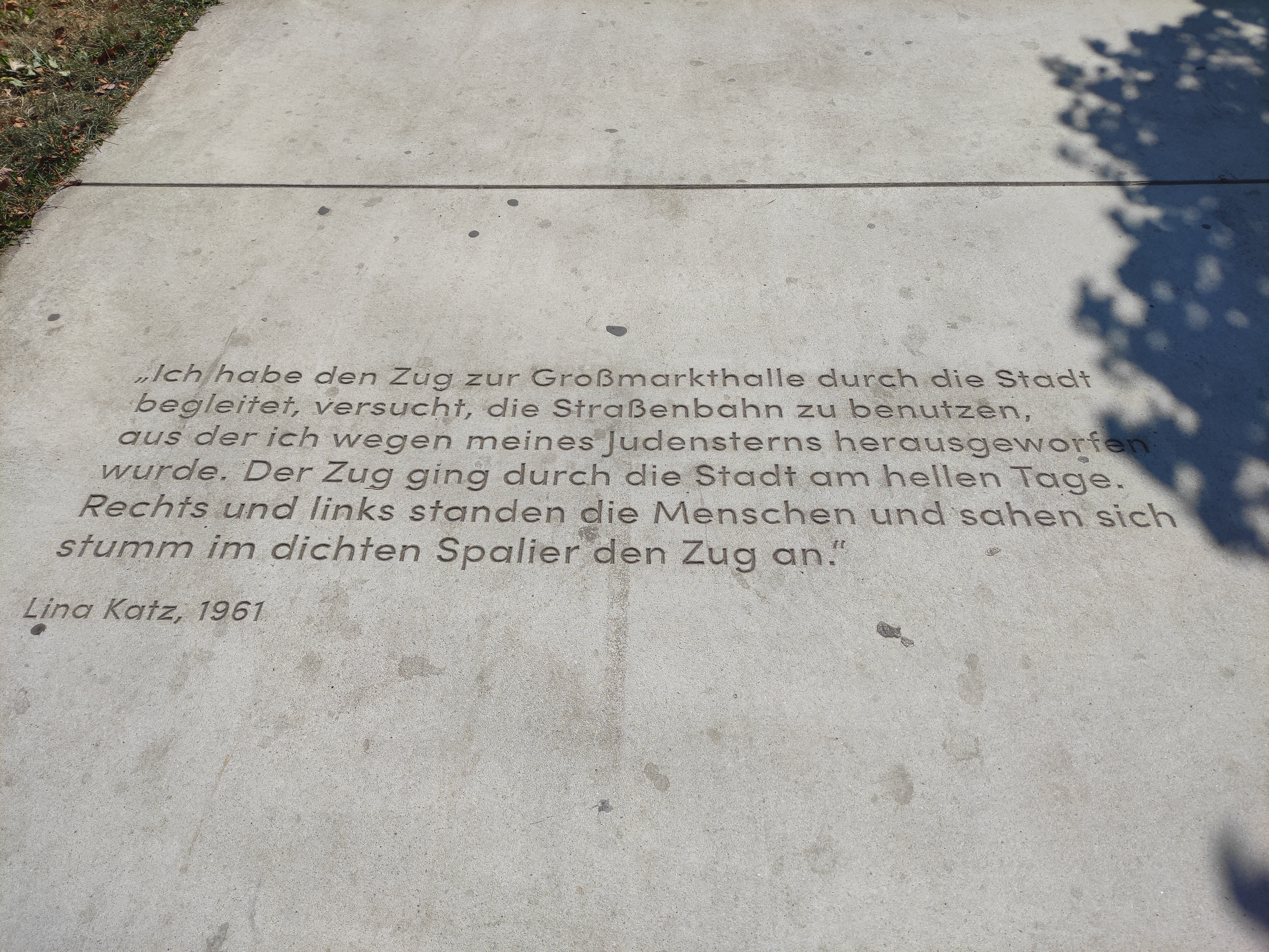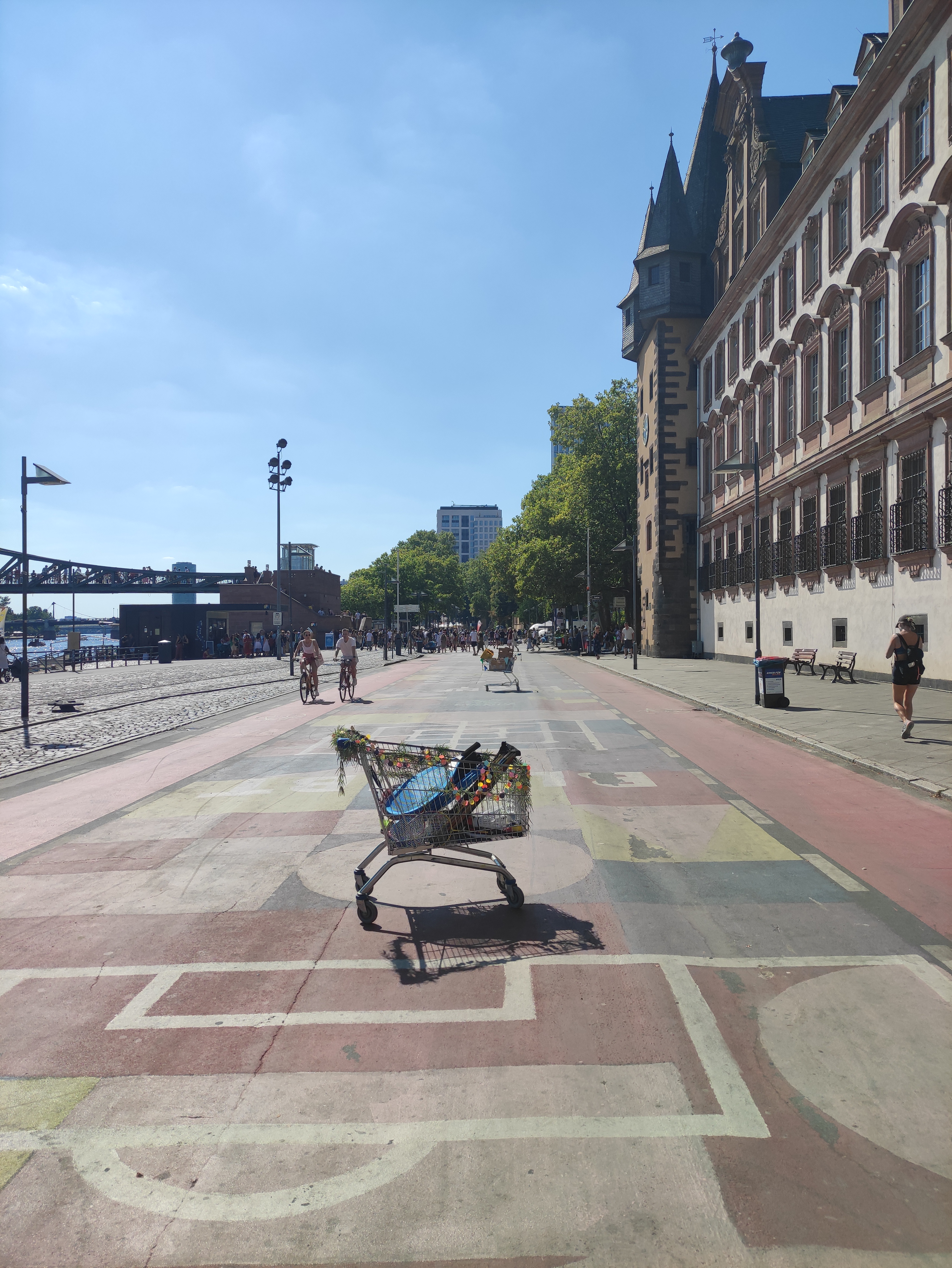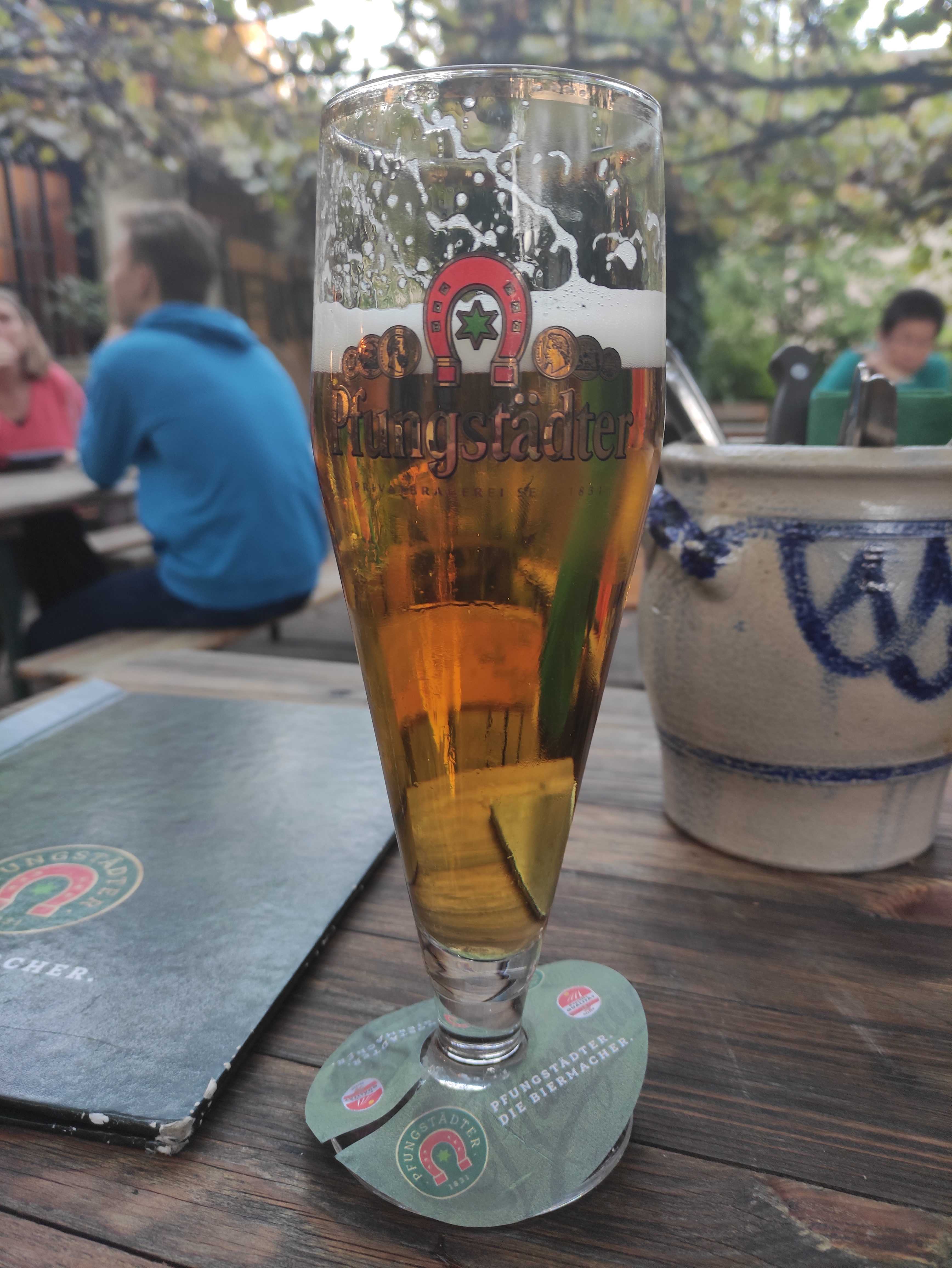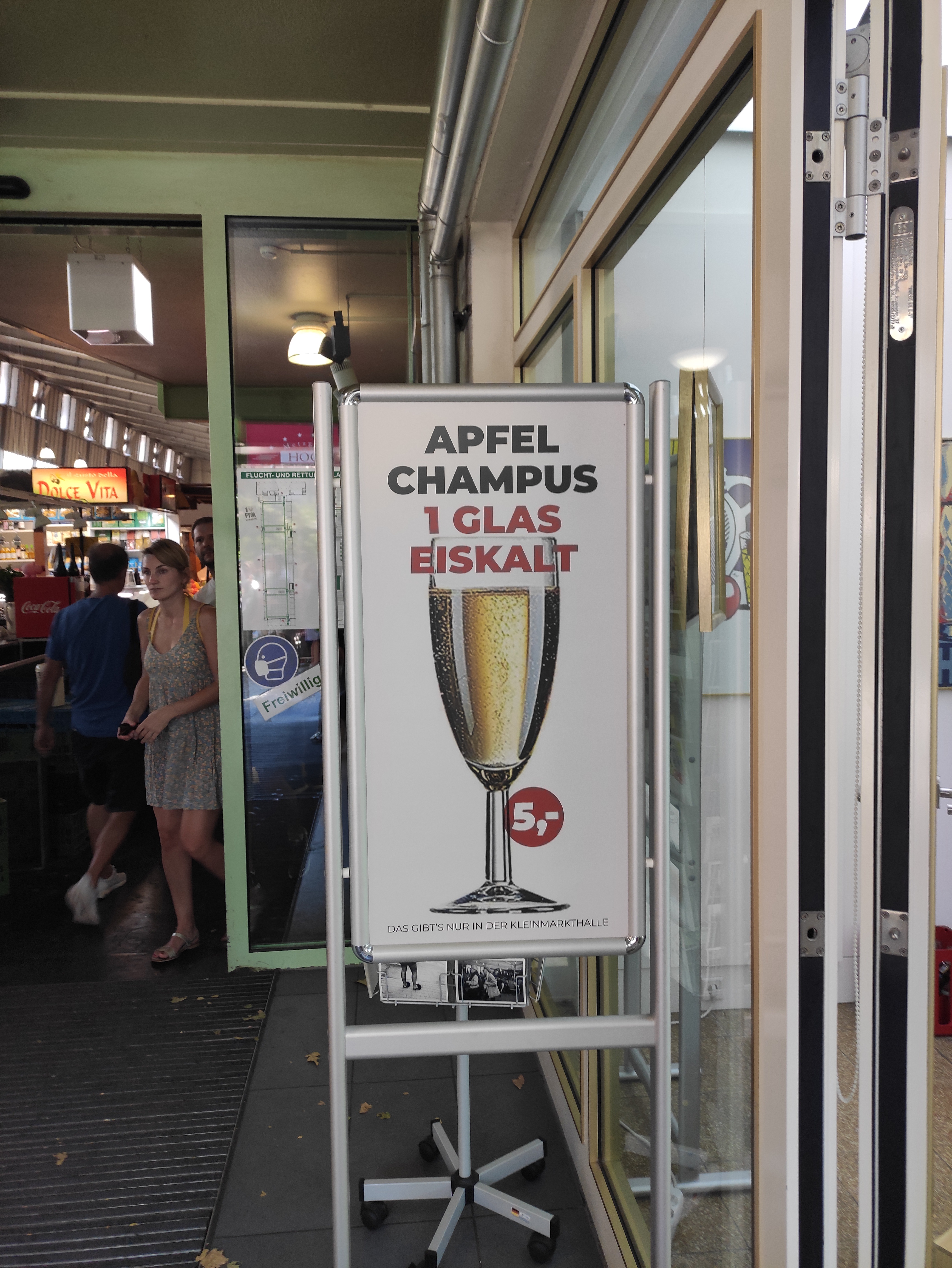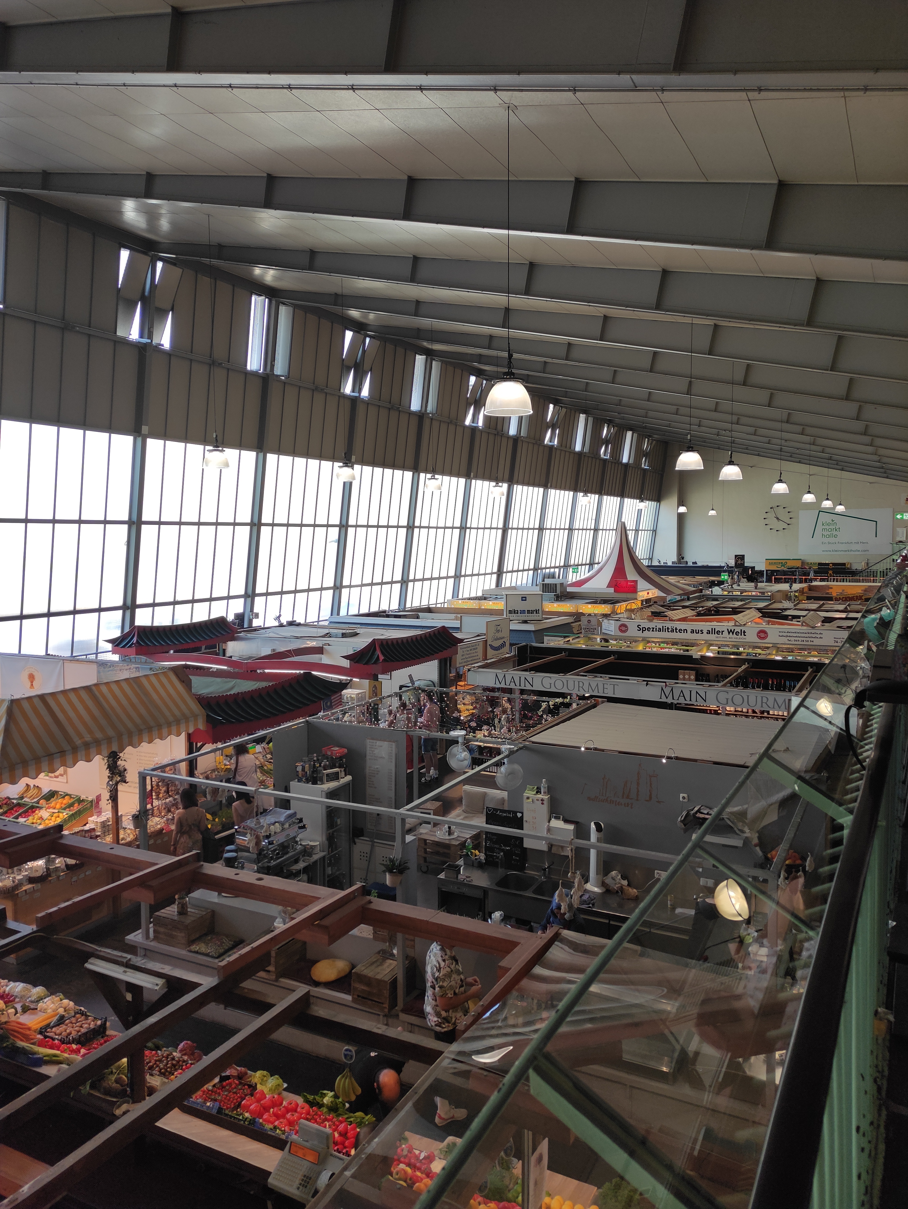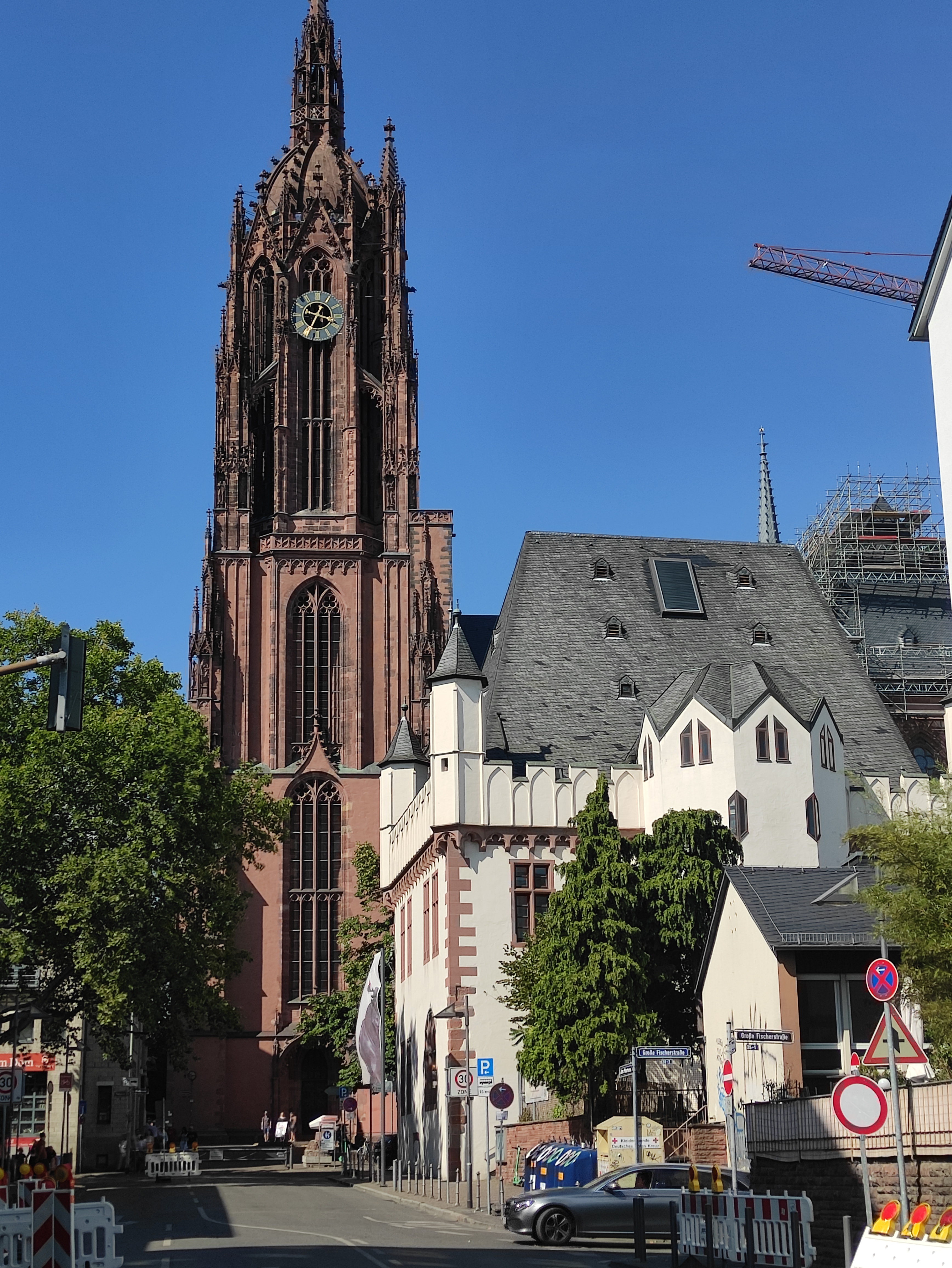 Gestärkt ging es zurück über den Bockenheimer Campus. An der Senckenberganlage die legendäre Adorno-Ampel. Der berühmte Philosoph und Soziologe soll gesagt haben, wenn die Studenten da sind wo sie sein sollen, nämlich in Gedanken, dann müsse dort eine Ampel hin. Adorno wurde der Wunsch erfüllt. Niemand weiß, wieviel gedankenversunkenen Studentinnen und Studenten dadurch das Leben gerettet wurde. Weiter durch vertrautes Terrain, den Kettenhofweg, mittlerweile zur Fahrradstraße umgestaltet. Früher mein Arbeitsweg zum Suhrkamp Verlag in der Lindenstraße. Da Adorno schon erwähnt wurde, in dieser Straße hat er mit seiner Frau Gretel gewohnt. Vom ursprünglichen Plan zur Kleinmarkthalle zu gehen, um diverse Zutaten für Harissa zu besorgen, bin ich abgekommen. Die Beine waren zu schwer. Statt dessen auf dem Markt an der Schillerstraße einen Riesling getrunken. Für mich der Abschluss des kleinen Ausflugs, der mir wieder mehr von der Stadt gezeigt hat, in der ich schon seit über zwanzig Jahren lebe. Der Heimweg nach Bornheim ist Routine und nicht der Rede wert. Zuhause hatte ich 23000 Schritte und 17 km in den Beinen und fühlte mich lebendig.