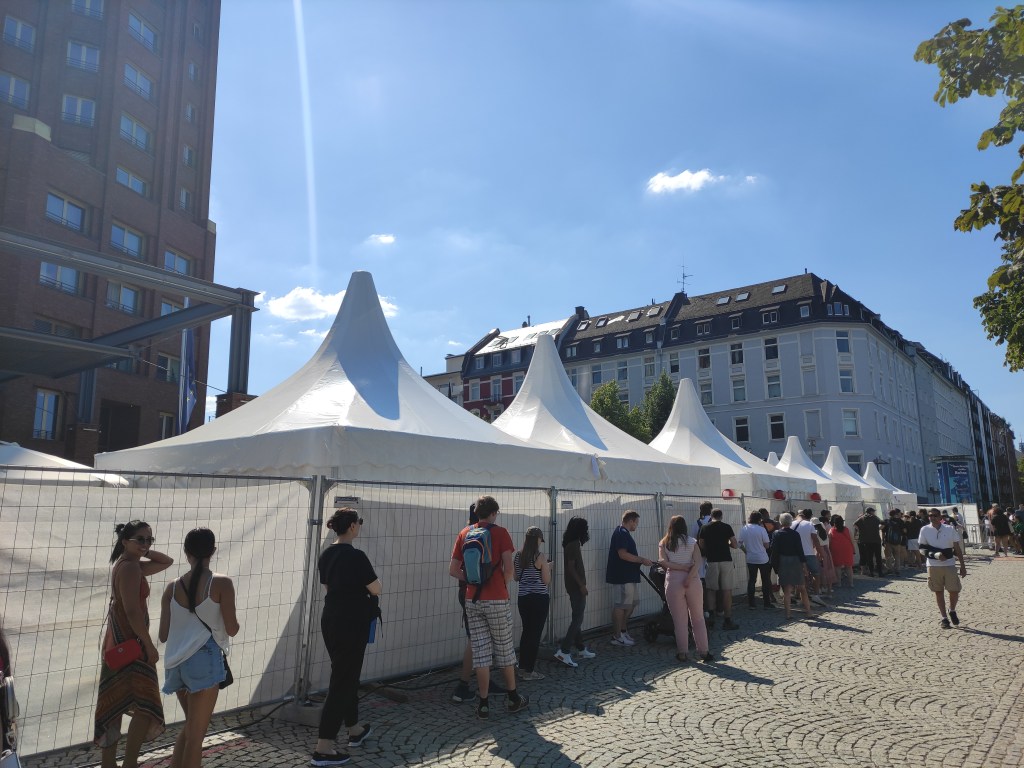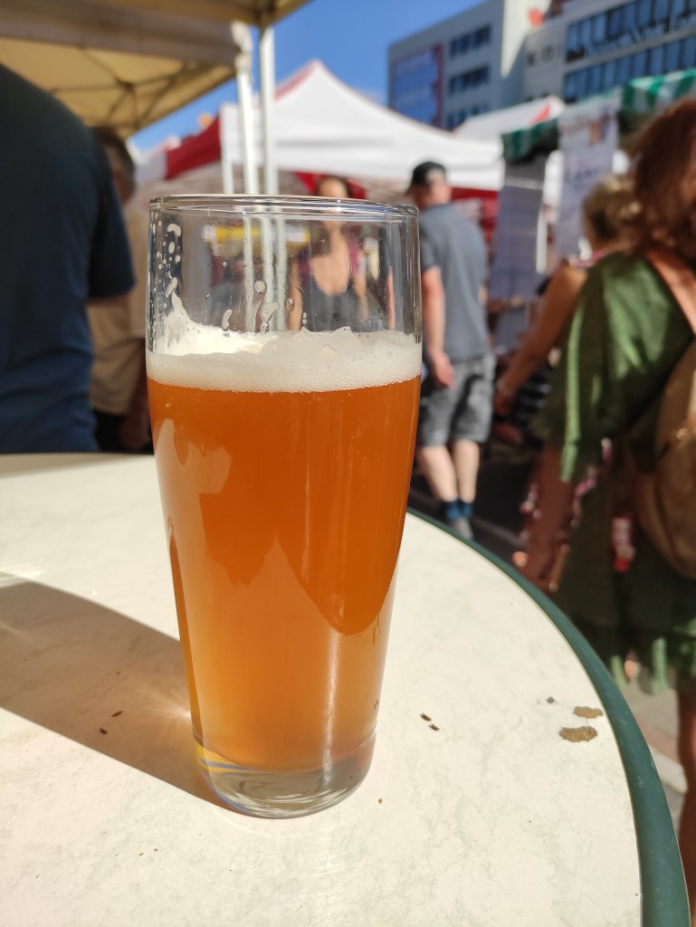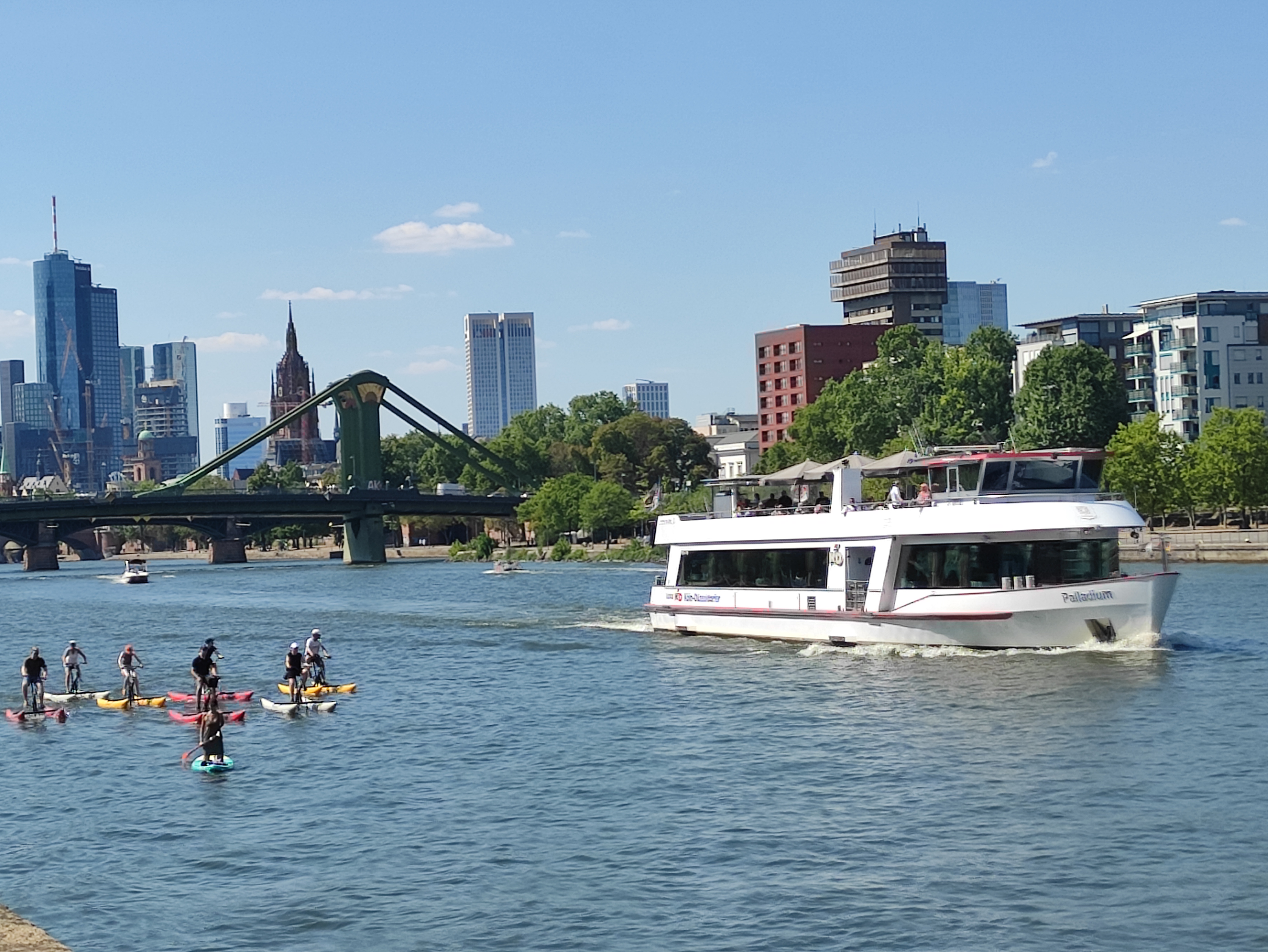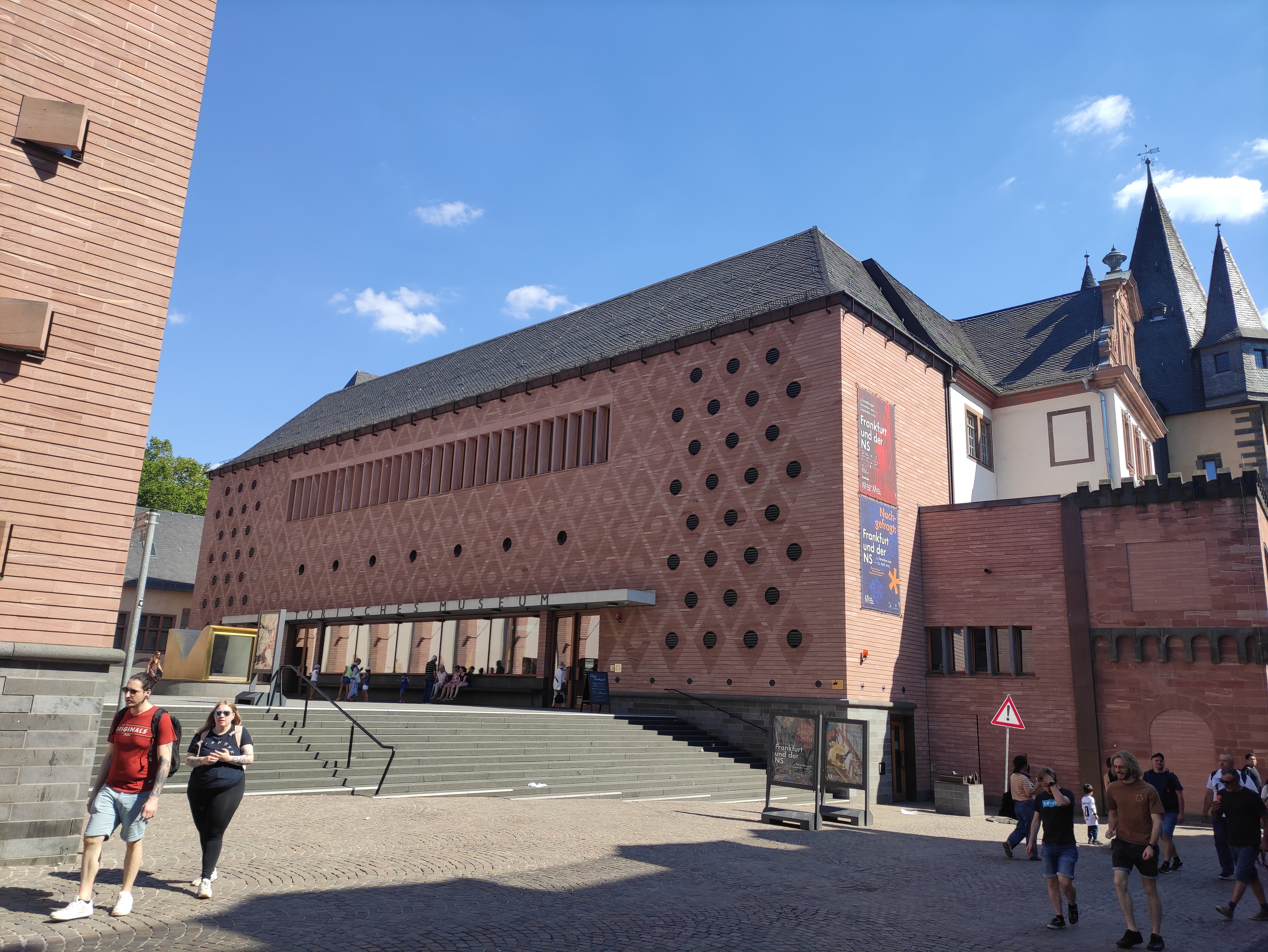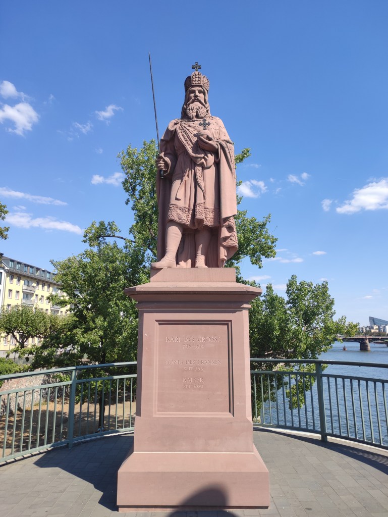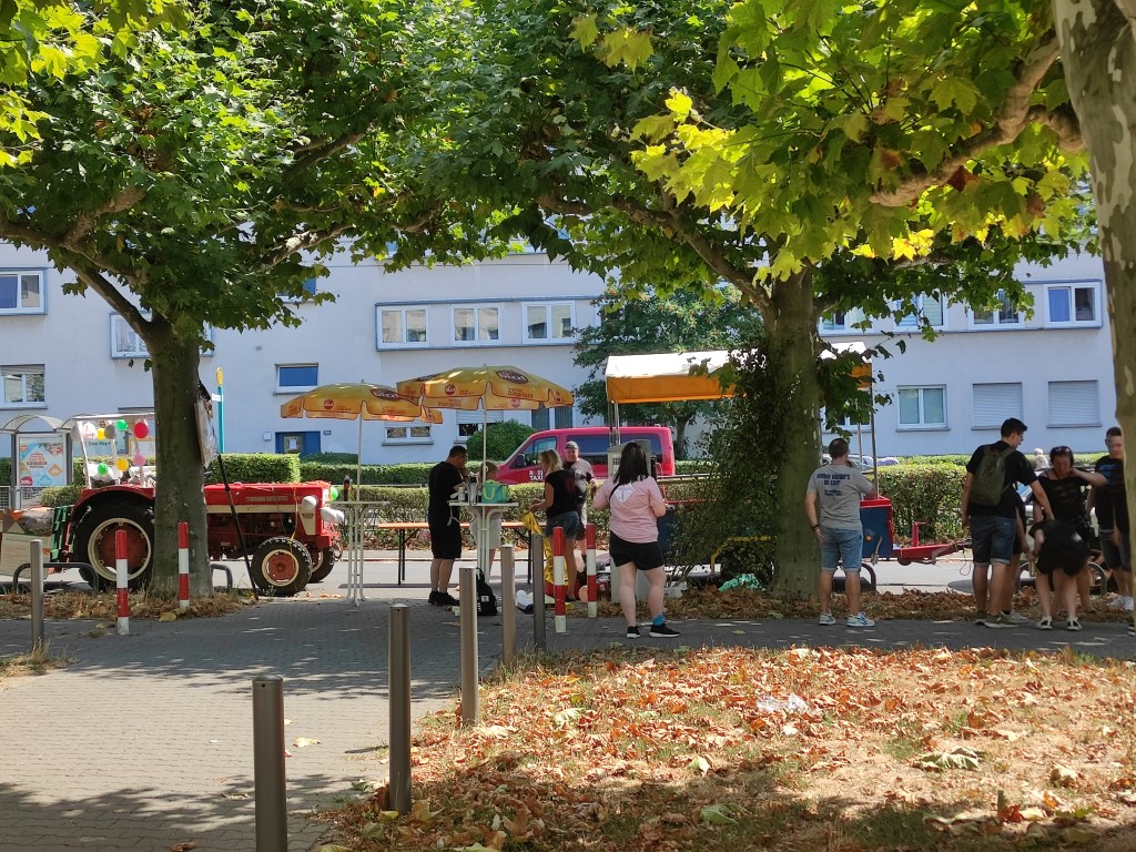 Gestärkt ging es zurück über den Bockenheimer Campus. An der Senckenberganlage die legendäre Adorno-Ampel. Der berühmte Philosoph und Soziologe soll gesagt haben, wenn die Studenten da sind wo sie sein sollen, nämlich in Gedanken, dann müsse dort eine Ampel hin. Adorno wurde der Wunsch erfüllt. Niemand weiß, wieviel gedankenversunkenen Studentinnen und Studenten dadurch das Leben gerettet wurde. Weiter durch vertrautes Terrain, den Kettenhofweg, mittlerweile zur Fahrradstraße umgestaltet. Früher mein Arbeitsweg zum Suhrkamp Verlag in der Lindenstraße. Da Adorno schon erwähnt wurde, in dieser Straße hat er mit seiner Frau Gretel gewohnt. Vom ursprünglichen Plan zur Kleinmarkthalle zu gehen, um diverse Zutaten für Harissa zu besorgen, bin ich abgekommen. Die Beine waren zu schwer. Statt dessen auf dem Markt an der Schillerstraße einen Riesling getrunken. Für mich der Abschluss des kleinen Ausflugs, der mir wieder mehr von der Stadt gezeigt hat, in der ich schon seit über zwanzig Jahren lebe. Der Heimweg nach Bornheim ist Routine und nicht der Rede wert. Zuhause hatte ich 23000 Schritte und 17 km in den Beinen und fühlte mich lebendig.