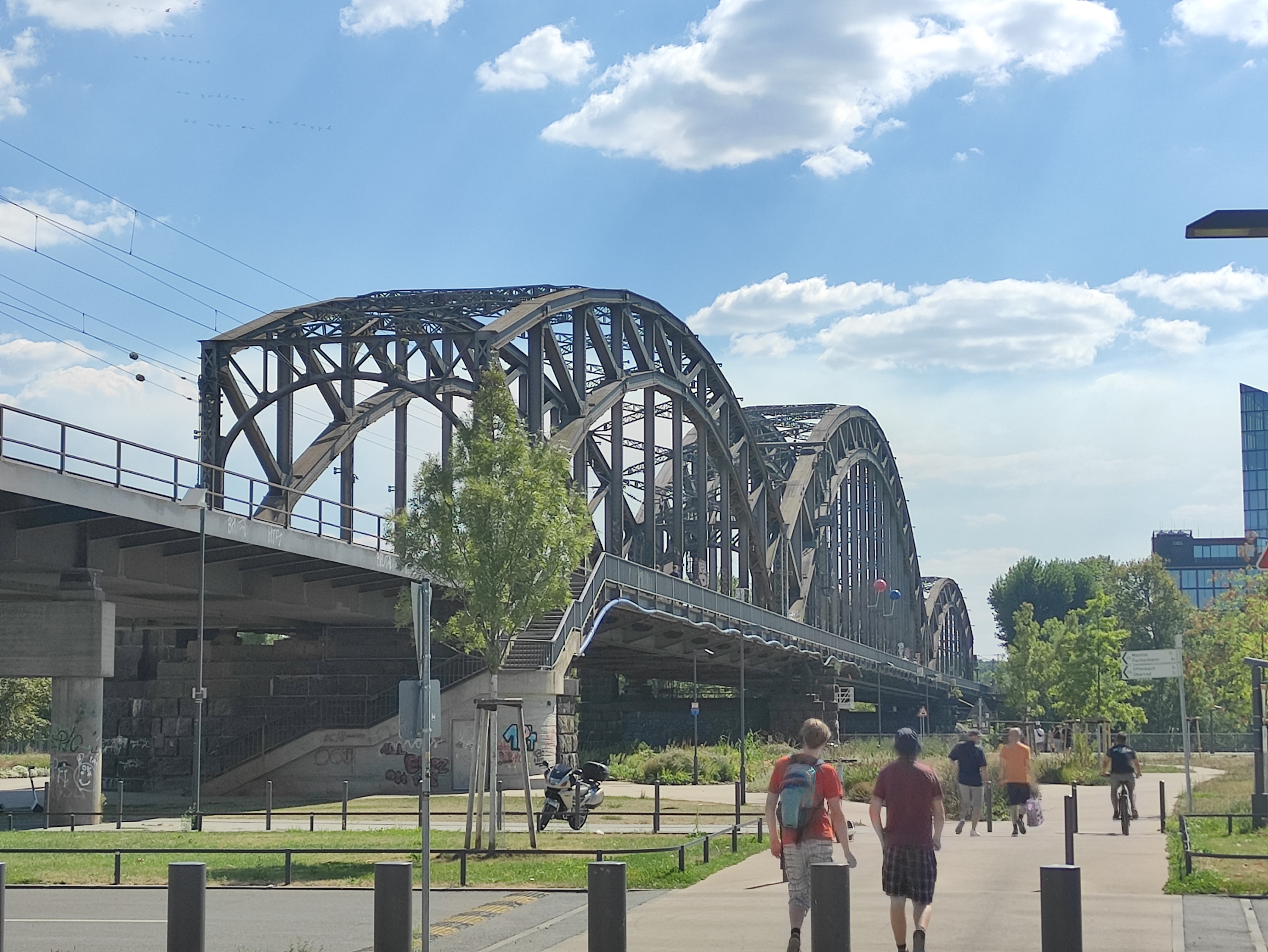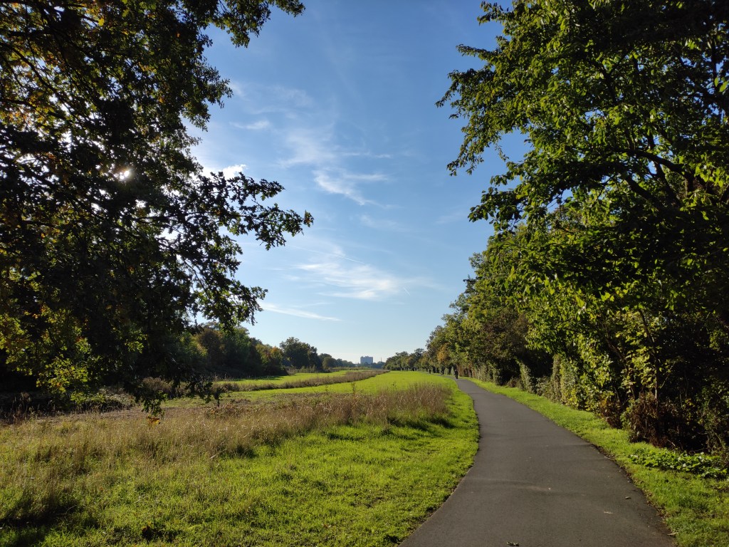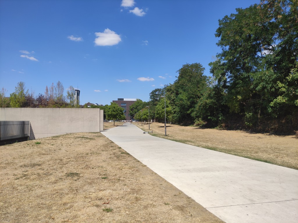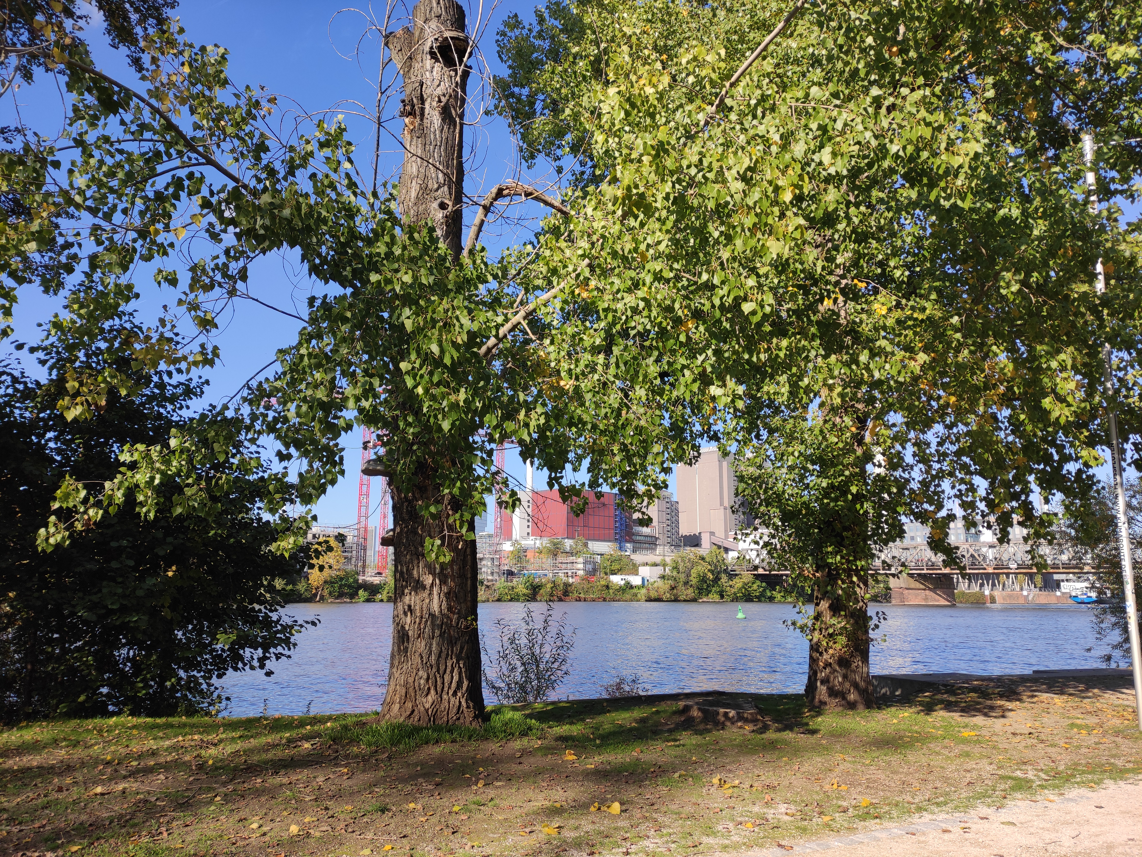Ich fand den richtigen Weg, weg von der Straße. Wieder ging es grün weiter, immer entlang des Steinbachs. Dann eine Brücke, ich war an der Nidda. In einem Nebenarm ließen sich zwei Schwäne treiben. Jenseits der Nidda ein Park, der Volkspark Niddatal. Ich war erfreut, den Park kannte ich nur peripher. War einmal dort mit einer Freundin laufen, lang ist es her. Wir fanden fast nicht mehr raus damals, orientierten uns am Fernsehturm und der Skyline. Das der Park groß ist wusste ich, dass er so groß ist jedoch nicht. Eine Frau mit drei freilaufenden Hunden kreuzte meinen Weg. Die Tiere interessierten sich nicht für mich. Der Park wollte nicht enden, mir war`s recht. Irgendwann ein Hinweis auf den Ausgang Bockenheim. Ich konnte das Navi ausschalten, ab dort würde ich mich auskennen. Dass irgendwann eine Autobahnbrücke den Park kreuzen würde, war erwartbar.