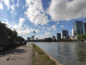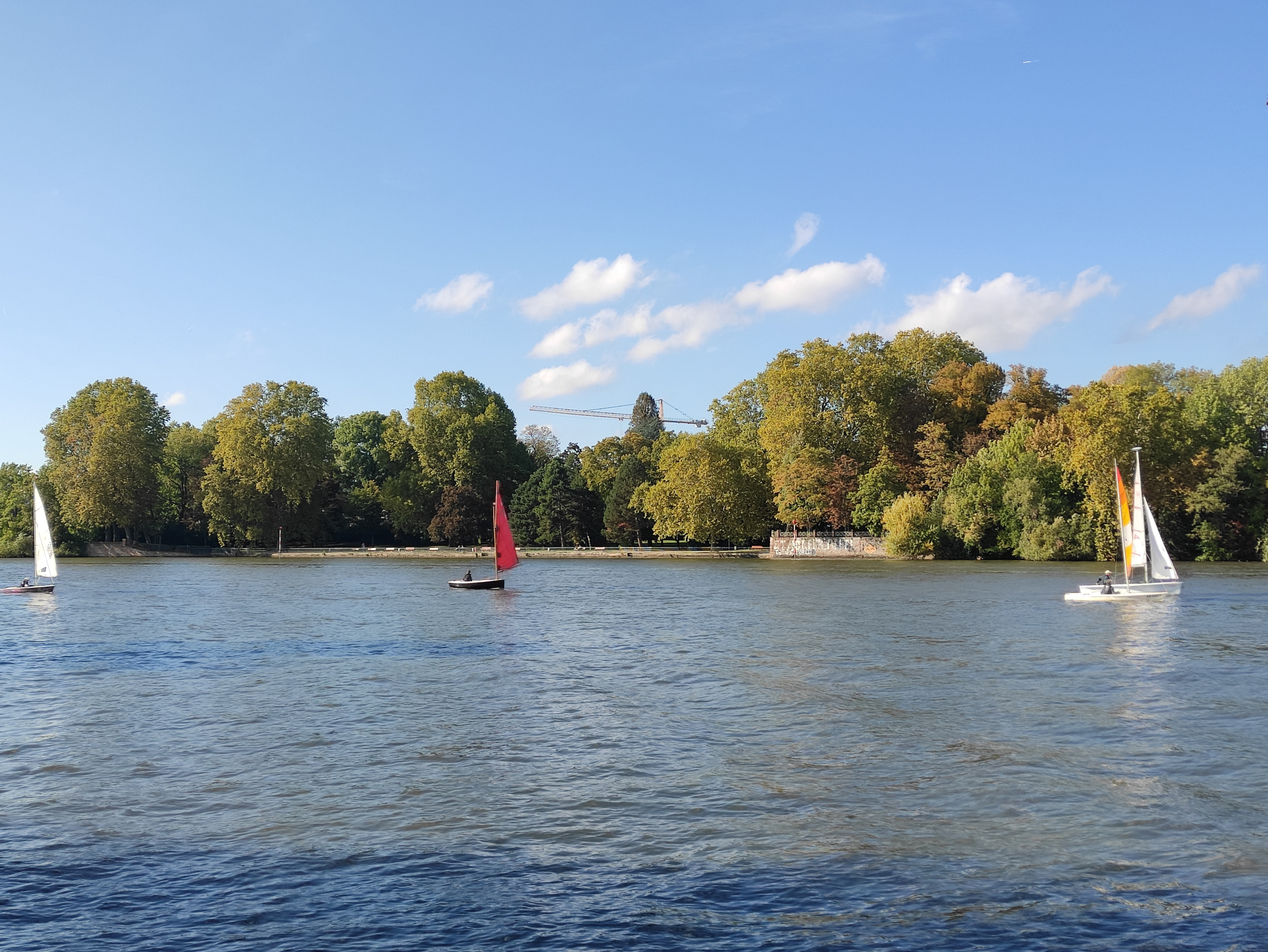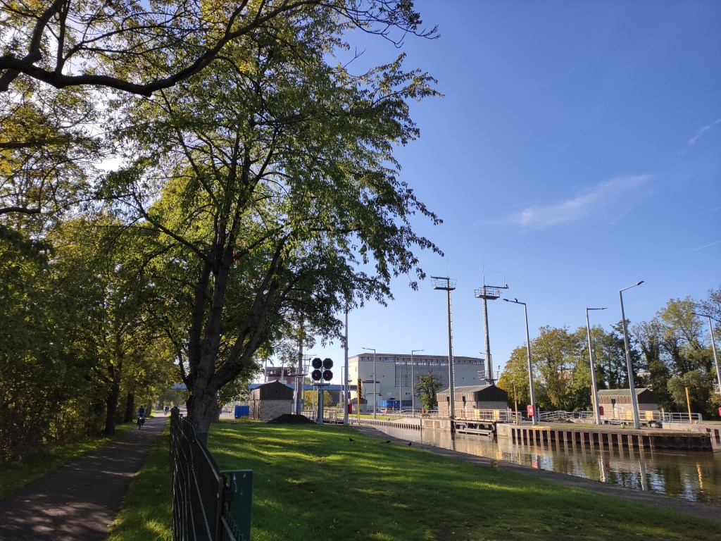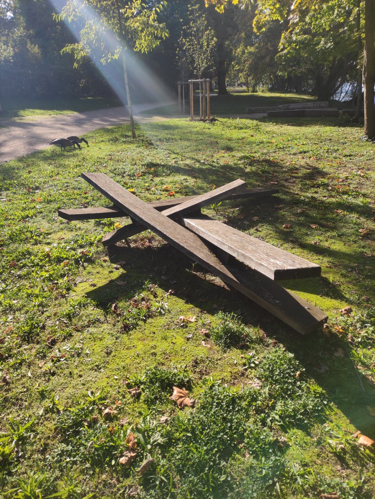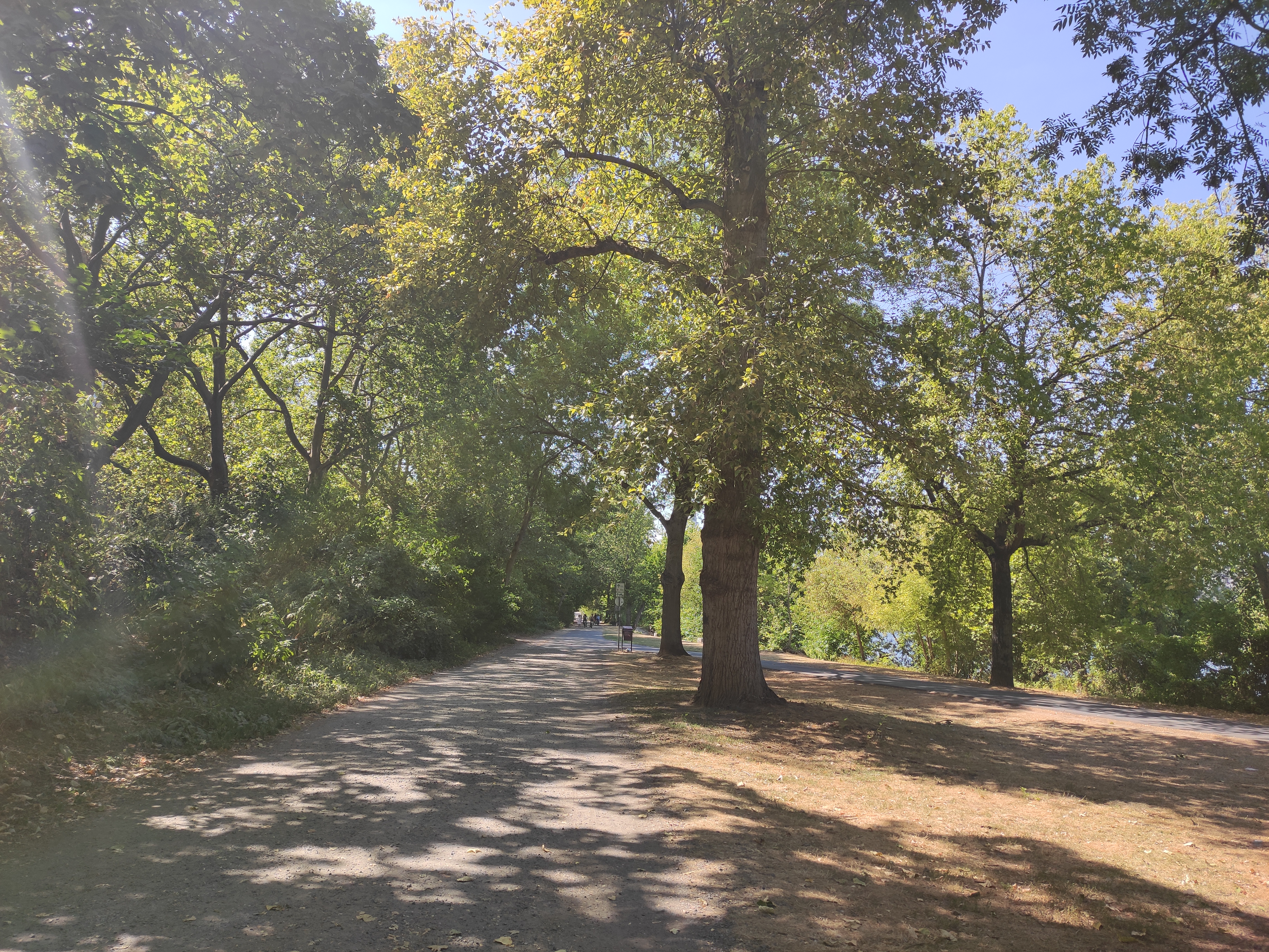 Ich fand den richtigen Weg, weg von der Straße. Wieder ging es grün weiter, immer entlang des Steinbachs. Dann eine Brücke, ich war an der Nidda. In einem Nebenarm ließen sich zwei Schwäne treiben. Jenseits der Nidda ein Park, der Volkspark Niddatal. Ich war erfreut, den Park kannte ich nur peripher. War einmal dort mit einer Freundin laufen, lang ist es her. Wir fanden fast nicht mehr raus damals, orientierten uns am Fernsehturm und der Skyline. Das der Park groß ist wusste ich, dass er so groß ist jedoch nicht. Eine Frau mit drei freilaufenden Hunden kreuzte meinen Weg. Die Tiere interessierten sich nicht für mich. Der Park wollte nicht enden, mir war`s recht. Irgendwann ein Hinweis auf den Ausgang Bockenheim. Ich konnte das Navi ausschalten, ab dort würde ich mich auskennen. Dass irgendwann eine Autobahnbrücke den Park kreuzen würde, war erwartbar.
