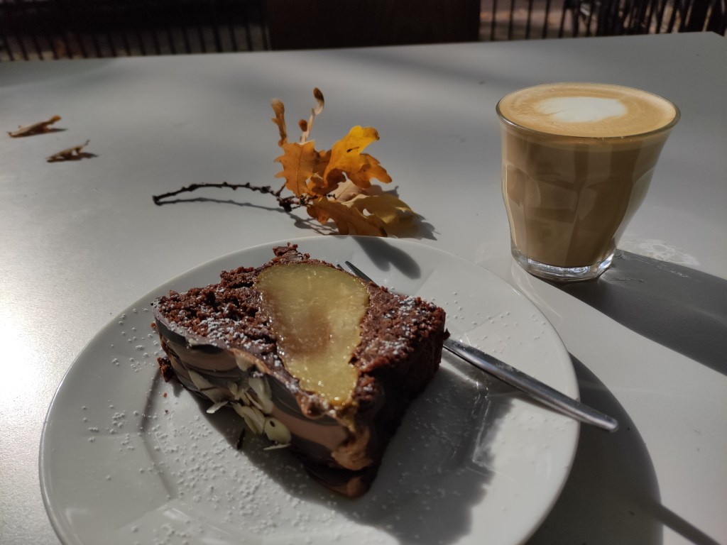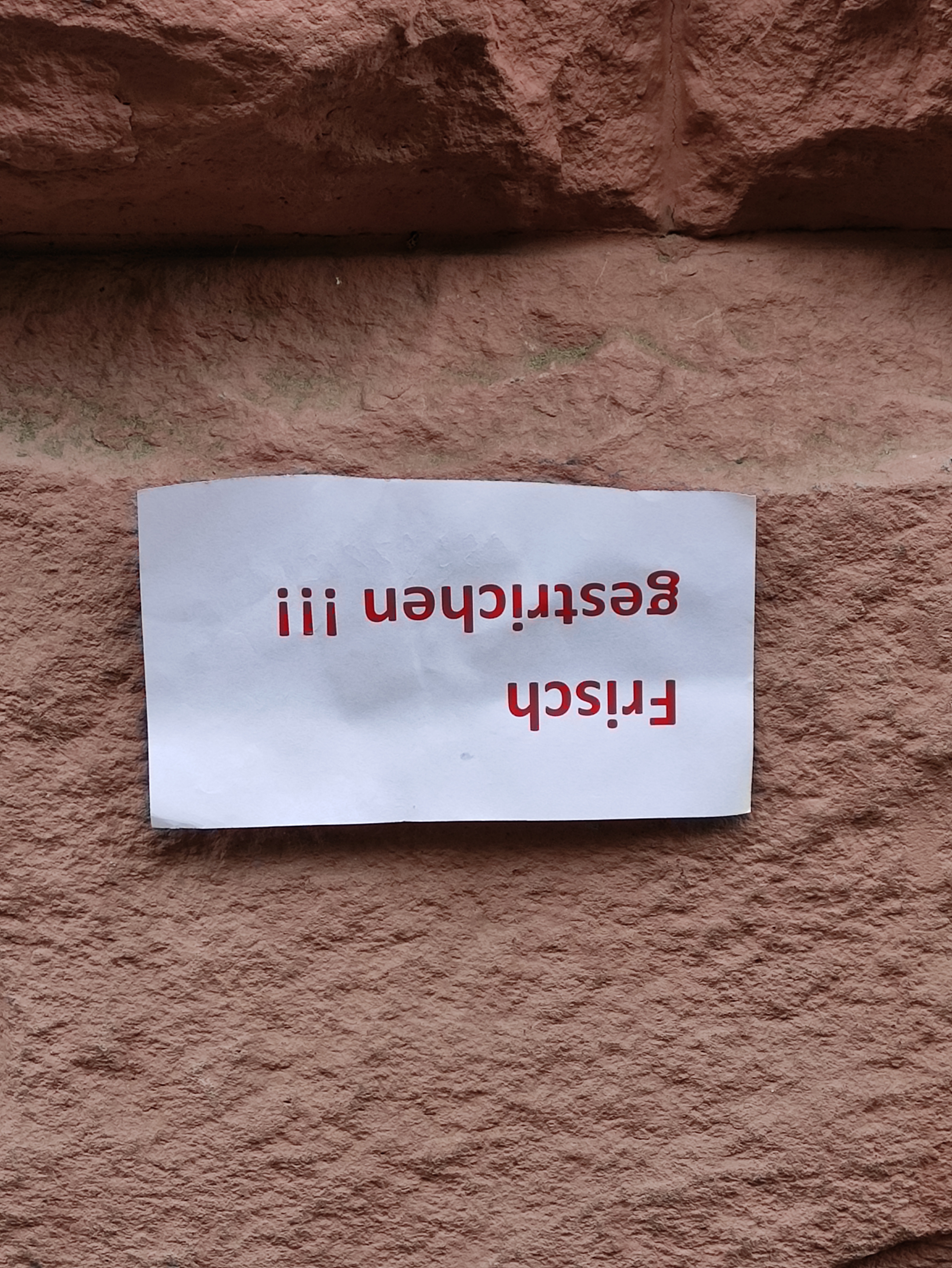Am Ausgang Bockenheim empfing mich das Yollow Submarine. Bald war ich an der Sophienstraße. Hier wohnte einst eine enge Freundin von mir, die genauso hieß wie die Straße. Wir haben uns oft gesehen, bis sie nichts mehr mit mir zu tun haben wollte, wieso auch immer. Sie wohnt dort auch nicht mehr. Auf der Leipziger Straße suchte ich ein Café, fand keins. Das einzige, das ich kannte, hatte geschlossen. Die Gegend war mir vertraut, habe ich doch vor einigen Jahren mal hier gearbeitet. In der Adalbertstraße entdeckte ich einen kleinen Bäcker mit zwei winzigen Tischen und einer schmalen Bank an der Wand. Ich bestellte einen großen Cappuccino im Pappbecher und ein riesiges Stück Kirschstreussel, das ich zur Hälfte schaffte. Es tat gut zu sitzen, der Kaffee schmeckte und tat was er tun musste.