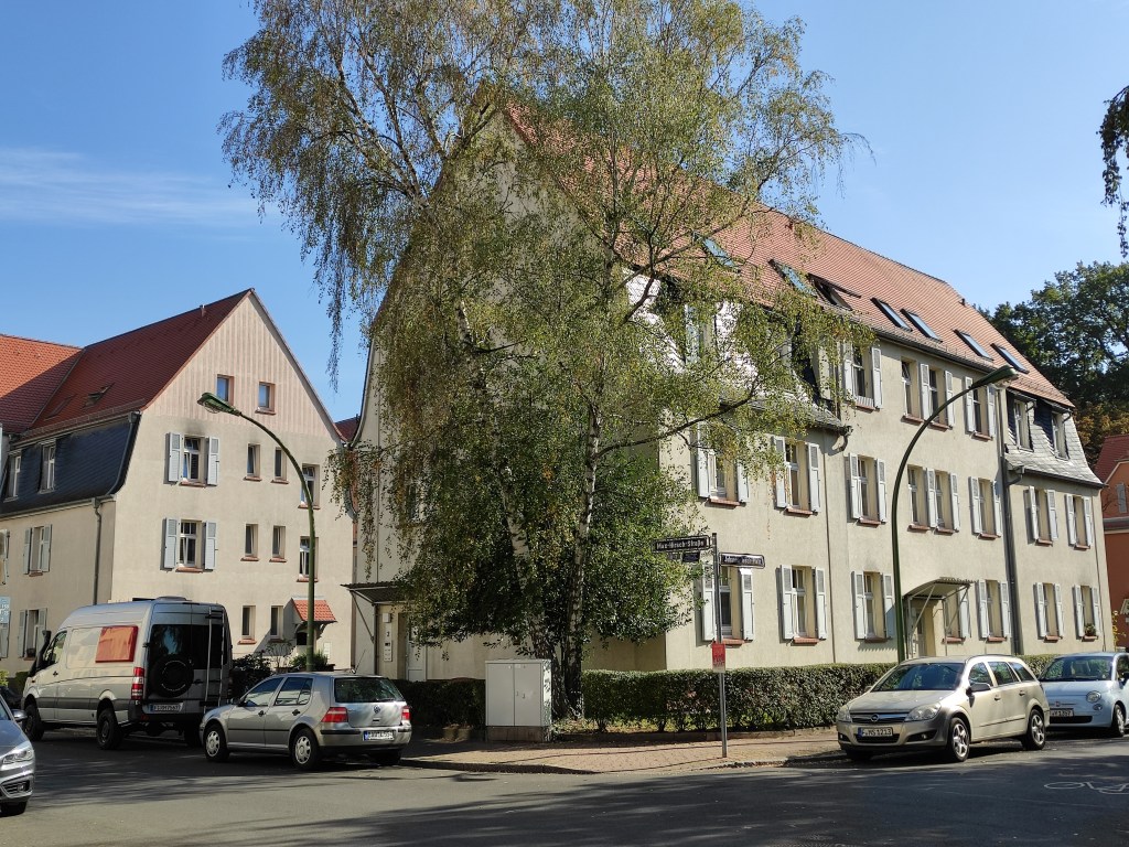 Es dauerte dann auch eine lange Zeit, bis ich zum ersten Mal durch die Riederwaldsiedlung spaziert bin, obwohl ich seit Jahren quasi in der Nachbarschaft wohne. Beim ersten Mal hielt ich auch vergeblich nach dem legendären Stadion Ausschau und war enttäuscht, es nicht zu finden. Dennoch war ich beeindruckt, hatte das, was sich mir bot, nicht erwartet. Ich nahm mir vor diesen Weg künftig häufiger zu gehen. Das habe ich durchaus getan, aber immer in Begleitung. Jetzt war es wieder soweit, diesmal alleine. Es war ein perfekter Herbsttag, einer dieser Tage, die gemeint sind wenn vom Goldenen Oktober die Rede ist. Ohnehin mein Lieblingsmonat, der Oktober. Also schnürte ich nach dem, wie immer späten Frühstück, meine Schuhe und spazierte los. Es ist nicht weit. Zum Ernst-May-Platz, dann zum Bornheimer Hang, vorbei am FSV Stadion und an der U-Bahn Station Johanna-Tesch-Platz über die Straße. Schon bin ich im Riederwald.