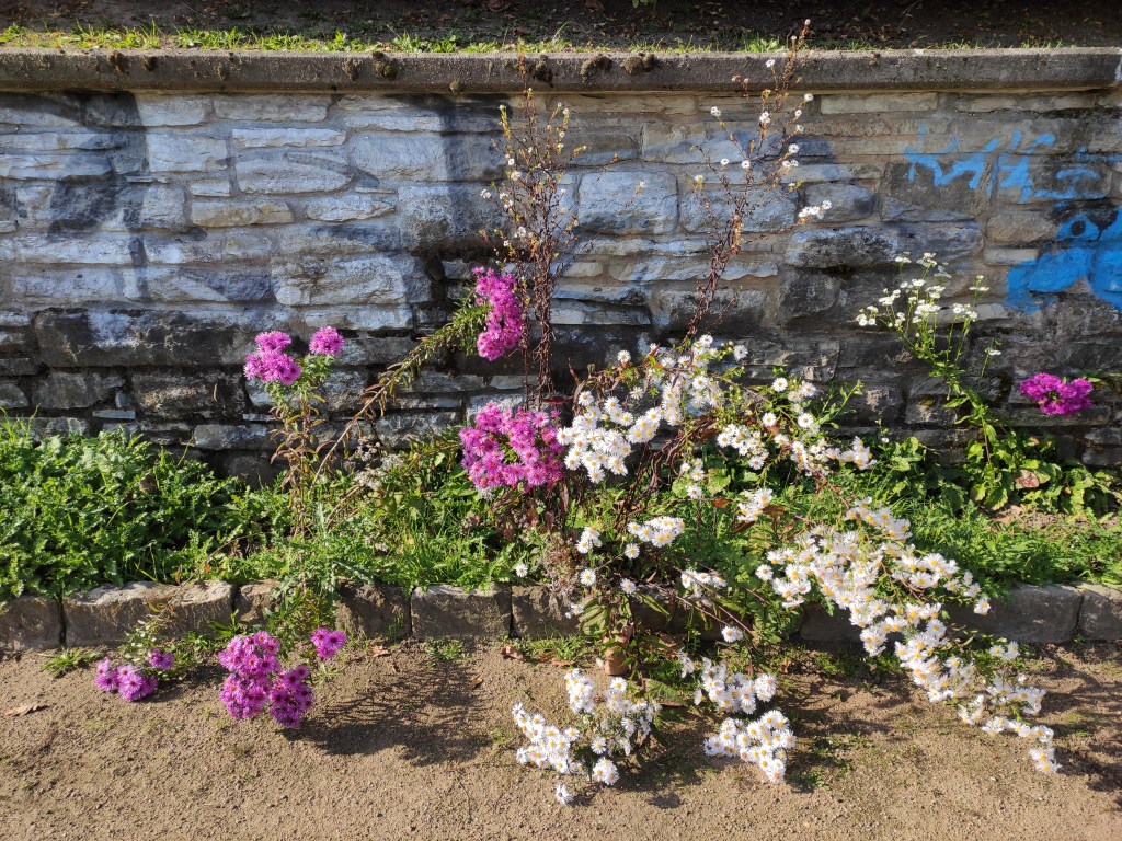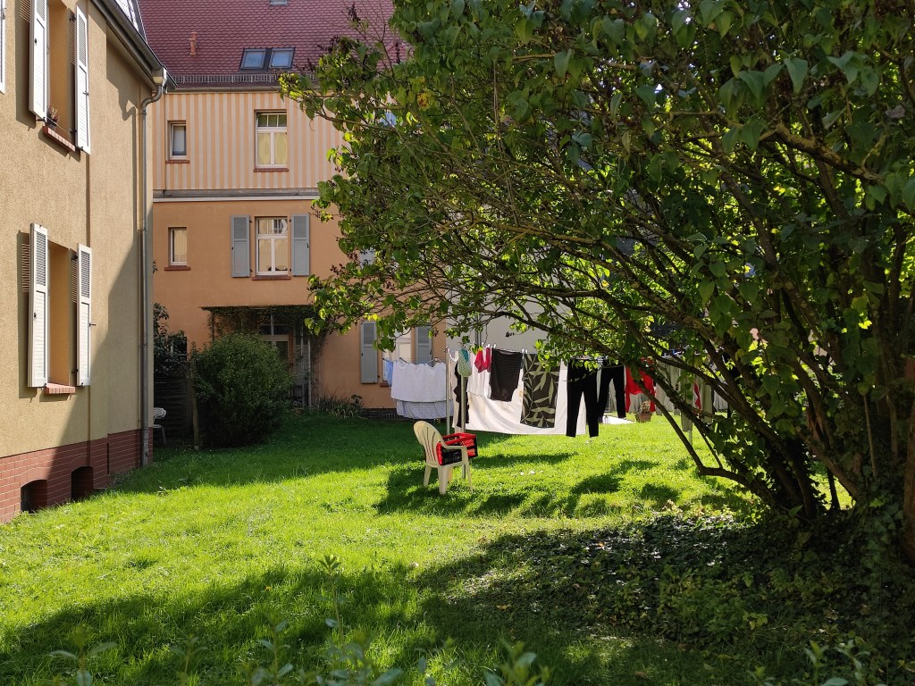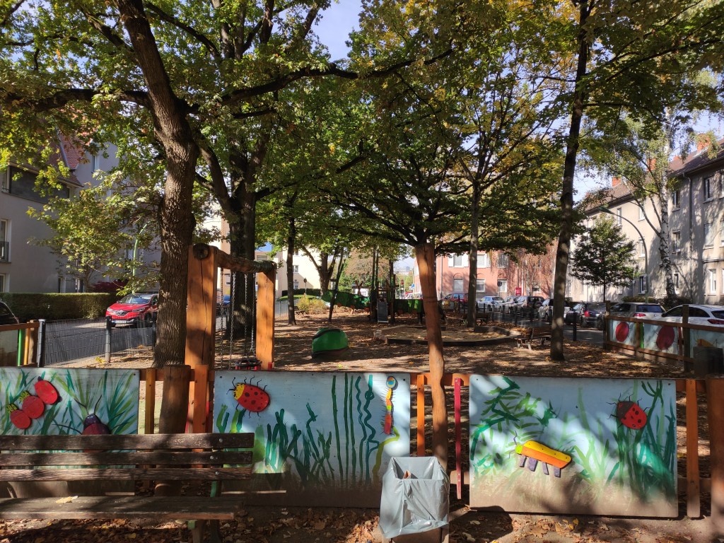 Jetzt habe ich einen neuen Weg entdeckt, ohne Zweifel der schönste, wenn auch längste. Aber, wie gesagt, es gibt keine Umwege beim Gehen. Dieser Spaziergang führt mich zunächst durch den Günthersburgpark, dann über einen schmalen Fußweg vorbei an einem Abenteuerspielplatz und Kleingärten auf der einen Seite sowie zunächst kleinen Ein- bis Zweifamilienhäusern und später Bauten aus den 60iger Jahren auf der anderen Seite. Autos sind nur in der Ferne vernehmbar. Entspanntes Spazieren also.