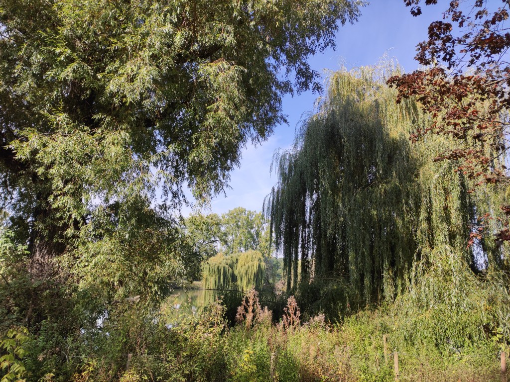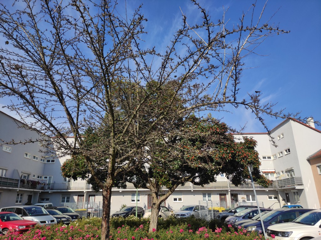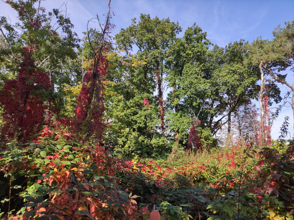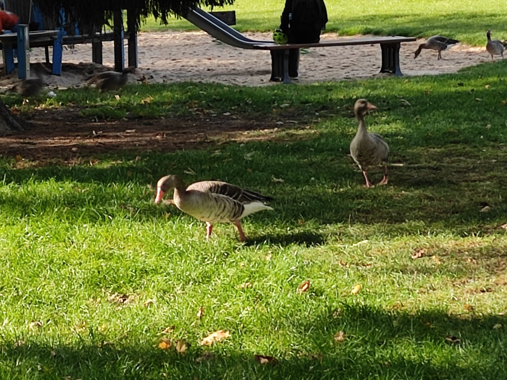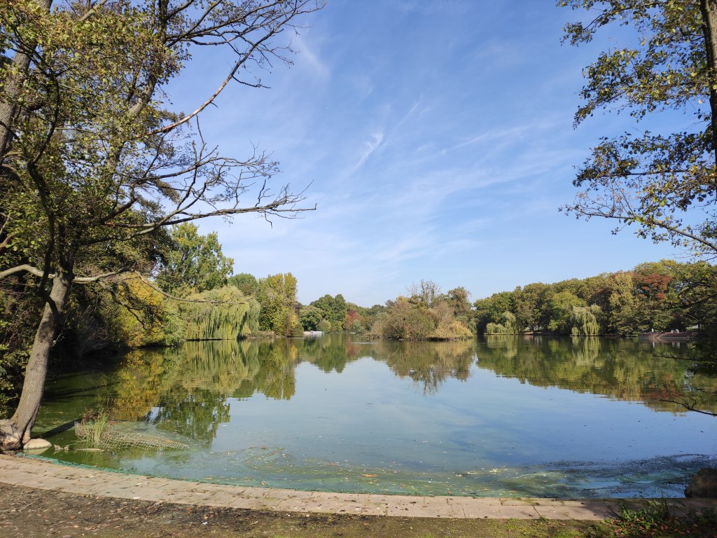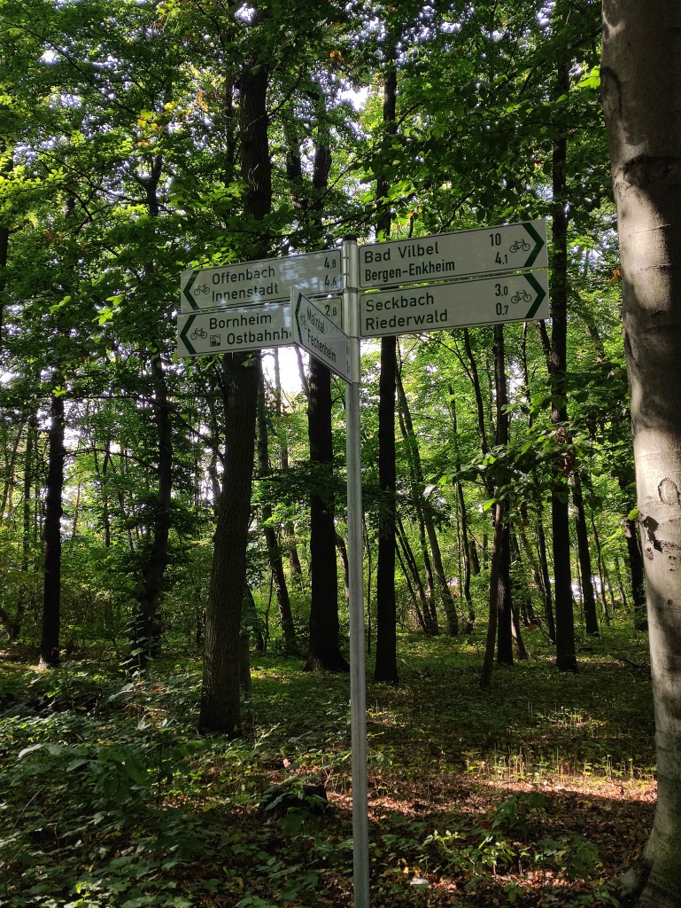Ich verlasse die Riederwaldsiedlung, vorbei am Gelände eines Geflügelzuchtvereins, einem türkischen Kulturverein sowie einer Kleingartensiedlung. Ein stolzer Hahn begrüßt mich. Der Wald, der so heißt wie die Siedlung, zeigt sich in herbstlicher Vielfalt. Ich folge dem ausgeschilderten, teilweise abenteuerlichen Radweg in Richtung Ostbahnhof, immer wieder erstaunt, wie die Radverbindungen in Frankfurt mittlerweile ausgeschildert sind, und lande, nach der Unterquerung der Autobahnbrücke, im Ostpark. Ich drehe noch eine halbe Runde. Bis vor einigen Jahren herrschte in diesem Park noch eine regelrechte Plage mit Nilgänsen. Wege und Wiesen waren verdreckt, es waren einfach viel zu viele. Irgendwie wurde es geschafft, die Tiere von hier zu vertreiben, so dass heute nur Graugänse zu sehen sind. Voller Eindrücke schlendere ich durch das Ostend nach Bornheim, quere vorher jedoch das Viertel rund um den Parlamentsplatz oberhalb des Ostparks. Grzimek soll hier irgendwo gewohnt haben. Nach 7.5 km war ich wieder zuhause. Ein schöner Spaziergang, vielleicht auch, weil die Eintracht am Vortag mit 1:2 bei Bayern München gewonnen hatte.