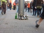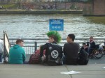Wie auch im letzten Jahr versammelte sich ein bunter Haufen von Demonstranten auf dem Platz. Junge Menschen mit Kapuzenshirts, Rentner, Familien mit Kindern, Gewerkschafter, NGOs, Politiker und Parteien. Es wurden Reden gehalten, Fahnen geschwenkt, Flugblätter verteilt und ein grauhaariger Herr sammelte verhalten Unterschriften, die der MLPD zur Teilnahme an der Bundestagswahl verhelfen sollten. Das Wetter wurde besser und die Stimmung war gut. An einem Laternenpfahl turnte eine Artistin, aus luftiger Höhe ein Transparent schwenkend: „Dem Kapitalismus auf der Nase tanzen!“