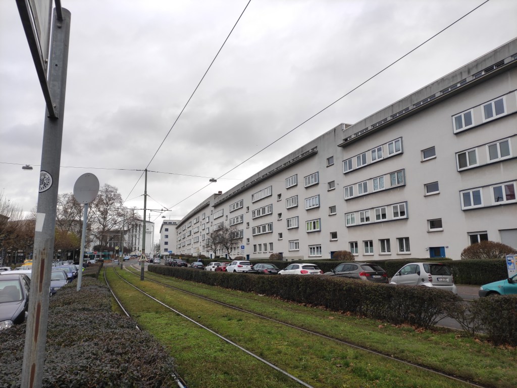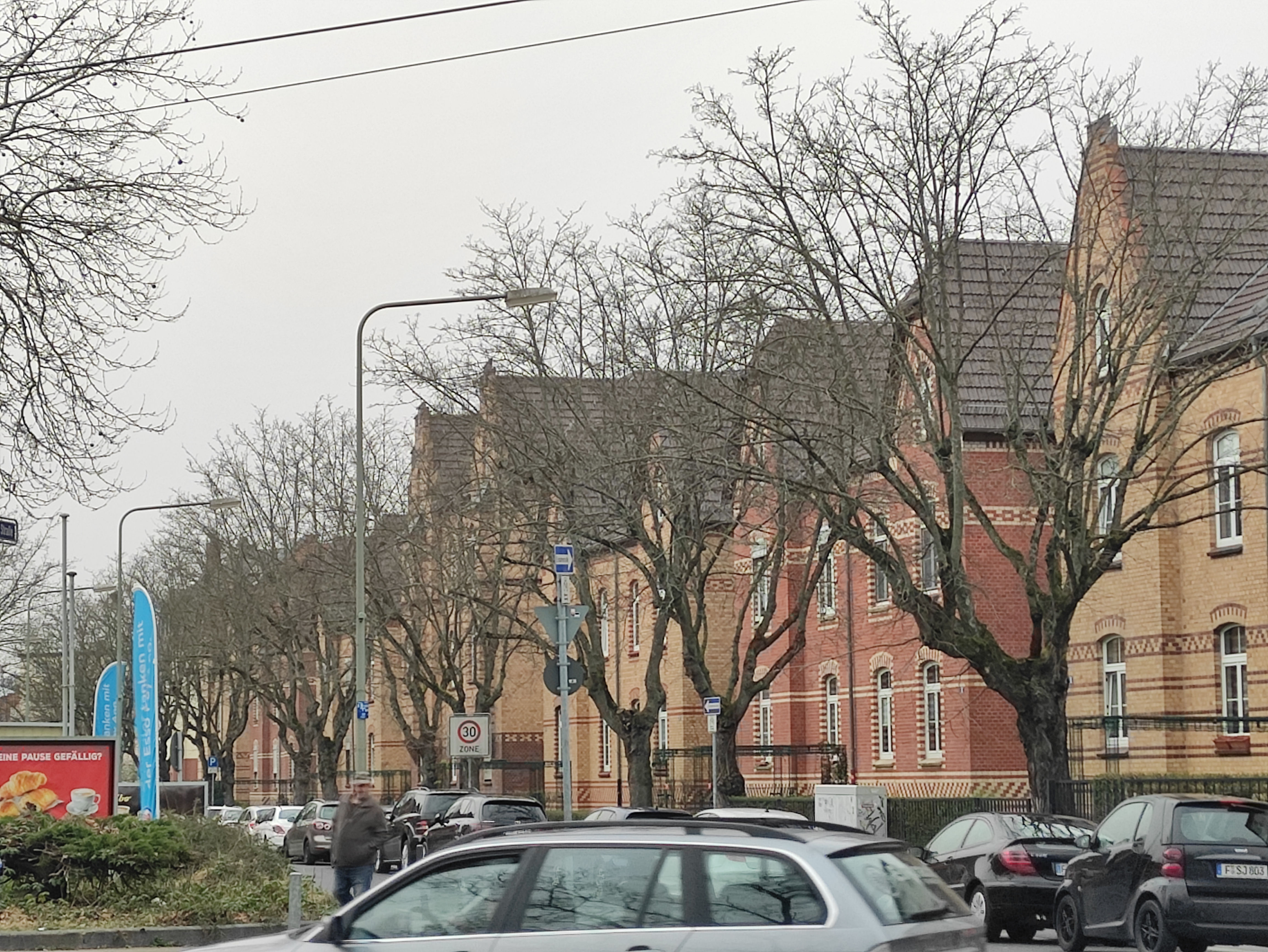Hinter Autohäusern versteckt eine eindringliche Mahnung. Erneut ändert die Straße ihren Charakter. Ab hier verläuft sie zweispurig, von Wohnhäusern gesäumt. Vor einer Mansardenwohnung trocknet Wäsche auf dem Dach, es ist windstill. Der Schriftzug der Adlerwerke überragt die Gegend. Der ehemals größte deutsche Fahrradproduzent, später auch von Nähmaschinen und Autos, diente Nazideutschland als wichtiger Hersteller für Rüstungsgüter, mit massivem Einsatz von Zwangsarbeitern. Erfahrung mit der Produktion für Rüstungszwecke hatte die Fabrik bereits im ersten Weltkrieg gesammelt. Ab dem August 1944 wurde in den Adlerwerken eine Außenstelle des KZ Natzweiler eingerichtet, unter dem Namen Katzbach. Die über 1600 Insassinnen und Insassen wurden als Zwangsarbeiter missbraucht, oft bis zum Tode. Kaum jemand überlebte. Es ist sehr lohnend sich näher mit der Geschichte dieser Fabrik zu beschäftigten. Am 25 März 2022 wird der Geschichtsort Adlerwerke eröffnet.