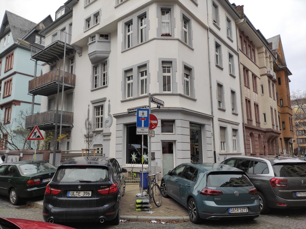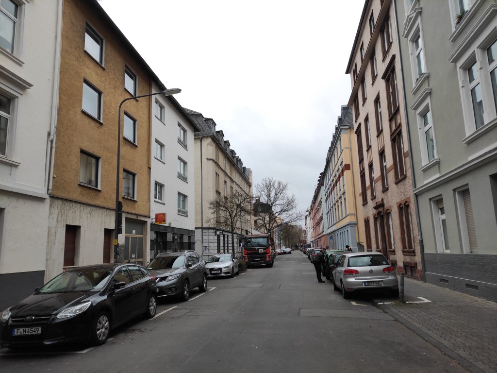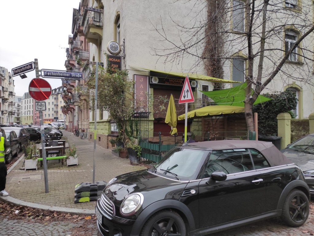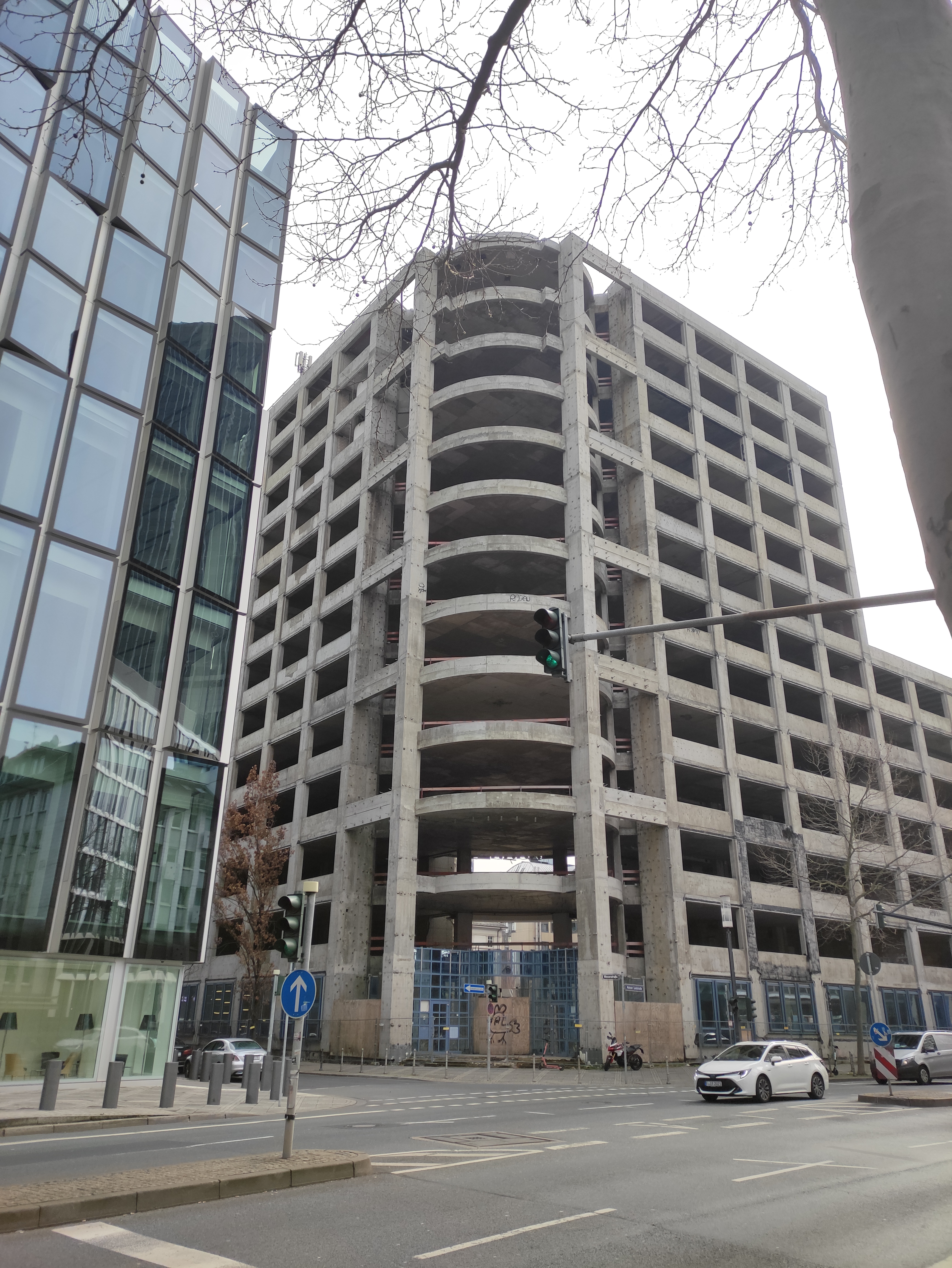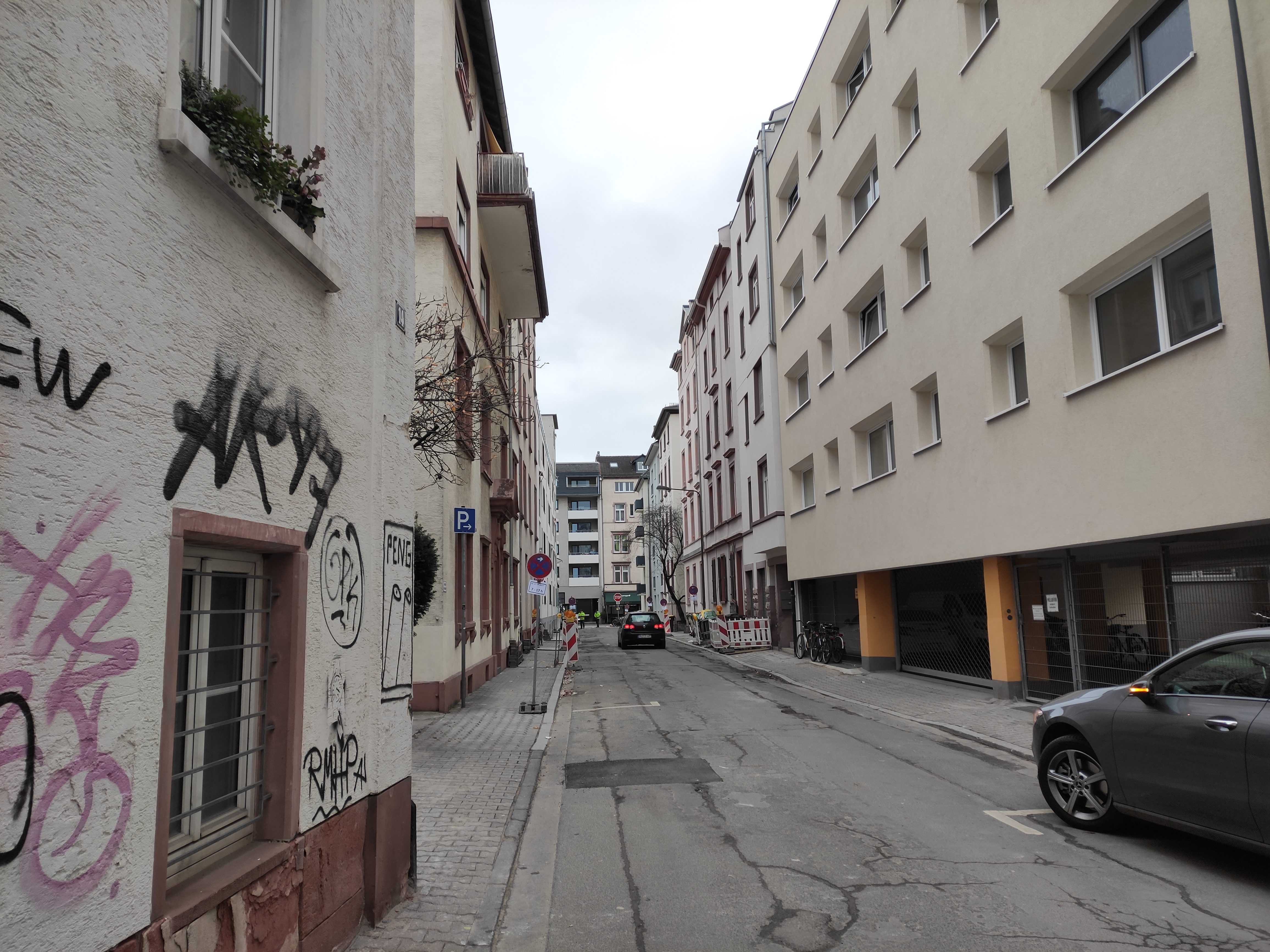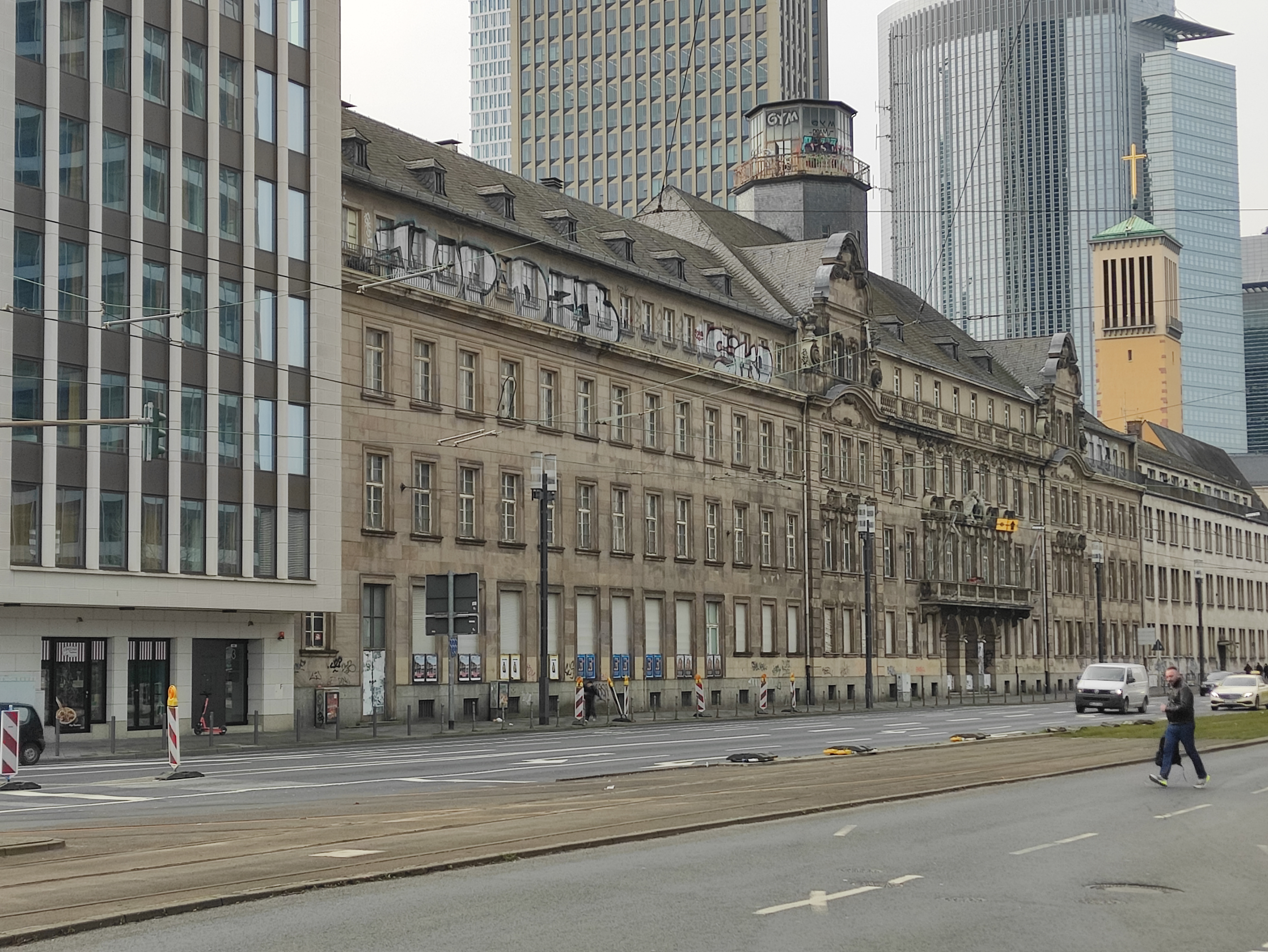 Die Skyline interessiert mich nicht so besonders. Klar, ein beliebtes Photomotiv, das ich aber nur selten ablichte, andere machen das zuhauf. Von diesen Häusern geht kein Leben aus. Nachts sind sie tot. Mich interessiert Frankfurt da, wo es aussieht wie Hannover, Stuttgart oder irgendeine beliebige andere Stadt. Aber wenn ein angenagtes Hochhaus der Sparkasse aus den sechziger Jahren seinen letzten Tagen entgegengeht, während im Hintergrund der Hauptturm des Quartiers „Four“ in den Himmel wächst, dann finde ich dass das schon ein Photo wert ist. Hier zeigt sich Umbruch, Anfang und Ende sowie Veränderung. Ob zum Besseren sei dahingestellt. In Höhe der Deutschen Bank ein weißes Ghoastbike, in Gedenken an einen 57-jährigen Radfahrer, der dort am 26.09.2019 zu Tode gekommen ist. Leider sind viele dieser Räder am Straßenrand zu sehen. An der Hausnummer 23 fällt ein Rohbau auf. Bautätigkeit ist keine zu beobachten. Die vierspurige Mainzer dient auch als Grenze zwischen dem vornehmen Westend und dem etwas verruchten Bahnhofsviertel.