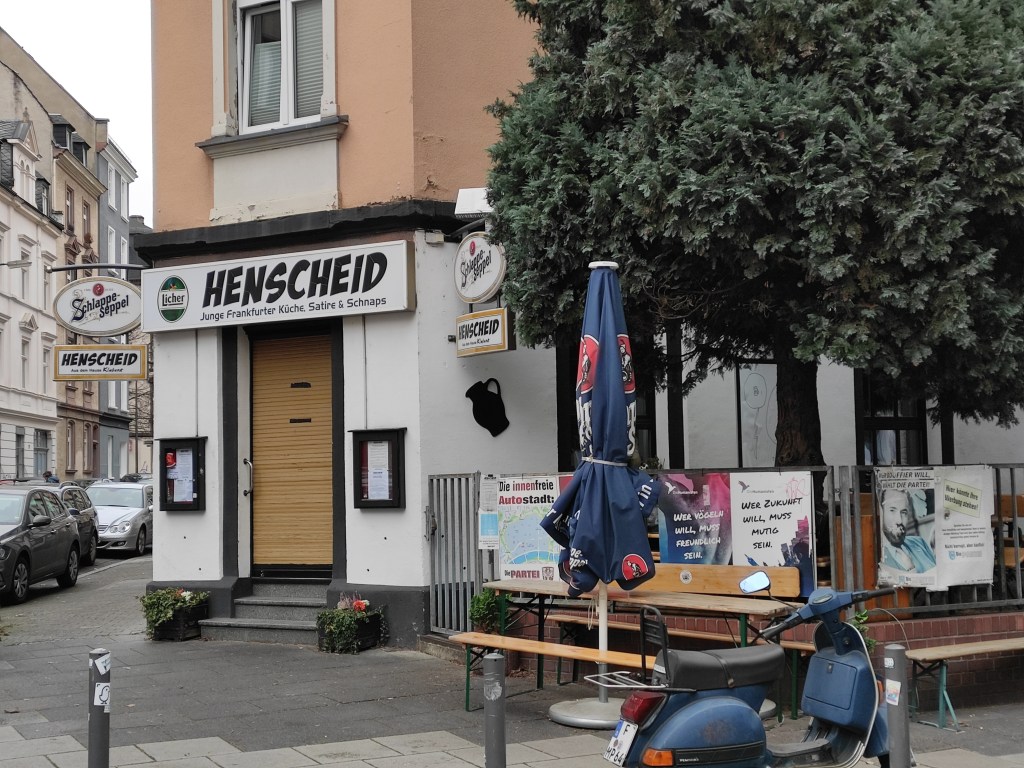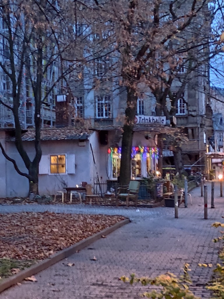 Dennoch blieb ein leicht leeres Gefühl, als ich meine Schritte wieder Richtung Bornheim lenkte. Wie meist wollte ich auf dem Heimweg an einem Lieblingsort vorbeischauen und dort einen Kaffee trinken, dem Wasserhäuschen Fein am Anlagenring. Dieses ehemalige, klassische Wasserhäuschen mit den typischen Bindingtrinkern wurde im vorletzten Jahr von einer sehr engagierten und phantasievollen Frankfurterin übernommen und überaus liebevoll hergerichtet. Es gibt dort guten Kaffee, Kuchen, allerlei anderen Süßkram, auch Wein, Apfelwein und selbstverständlich auch Bier. Der Platz rund um den Kiosk ist immer liebevoll möbliert. Ein Kleinod, das zum Verweilen einlädt. Allerdings nicht am letzten Donnerstag. „Ferien bis 8. Januar“ verkündete ein Zettel an der geschlossenen Jalousie. Jetzt freu ich mich auf den nächsten Donnerstag.