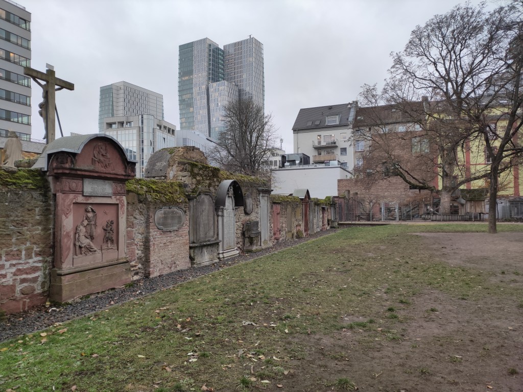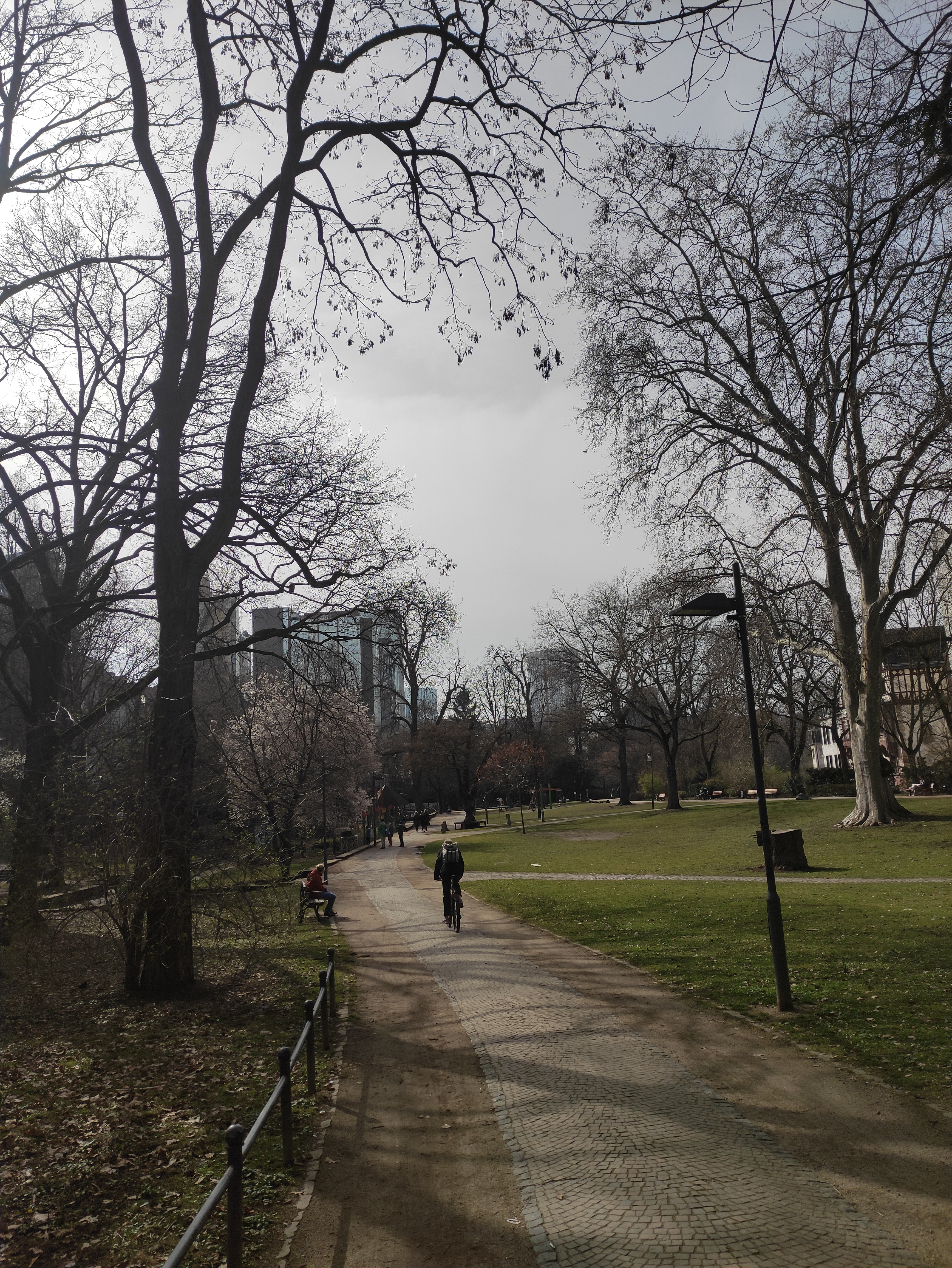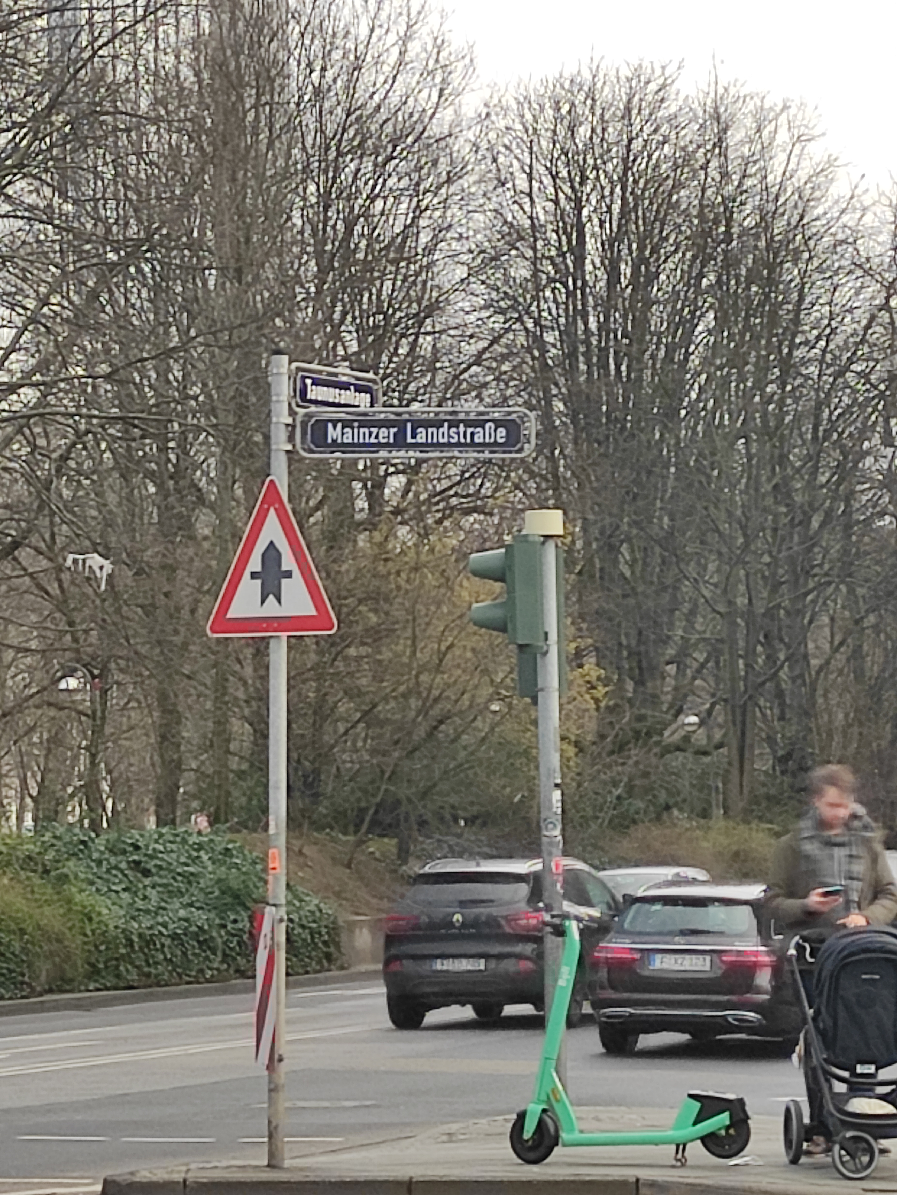 Zunächst altbekannte und oft gegangene Wege. Beim Fein, einem Lieblingsort, zur Stärkung einen Cappuccino. Weiter durch die Wallanlagen, der Frühling zeigte sich, jedoch noch vorsichtig. Endlich am Opernplatz. Anschließend die Taunusanlage, früher Treffpunkt sämtlicher Junkies der Stadt, mittlerweile eine aufgeräumte Grünanlage mit teilweise schrecklicher Kunst inmitten des Bankenviertels. Direkt anschließend die Mainzer Landstraße. Acht Kilometer auf einer weitgehend schnurgeraden, wenig attraktiven Straße lagen vor mir. Keine sehr verlockende Aussicht. Aber einen schönen Spaziergang hatte ich auch nicht erwartet, im besten Falle einen interessanten und überraschenden.