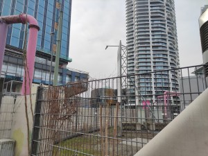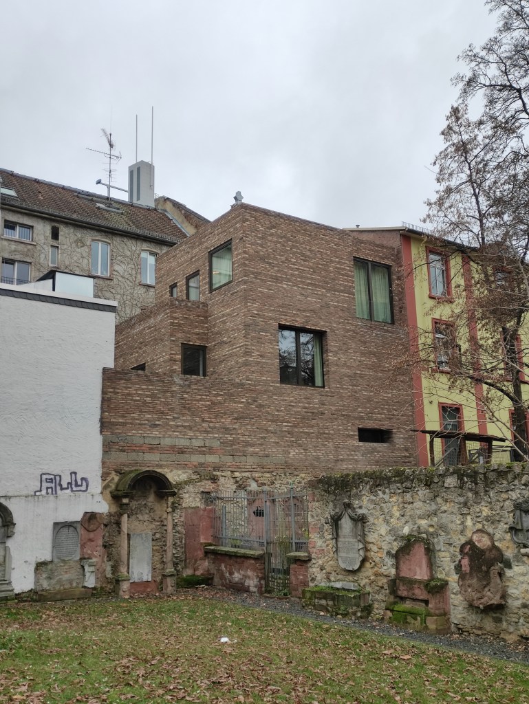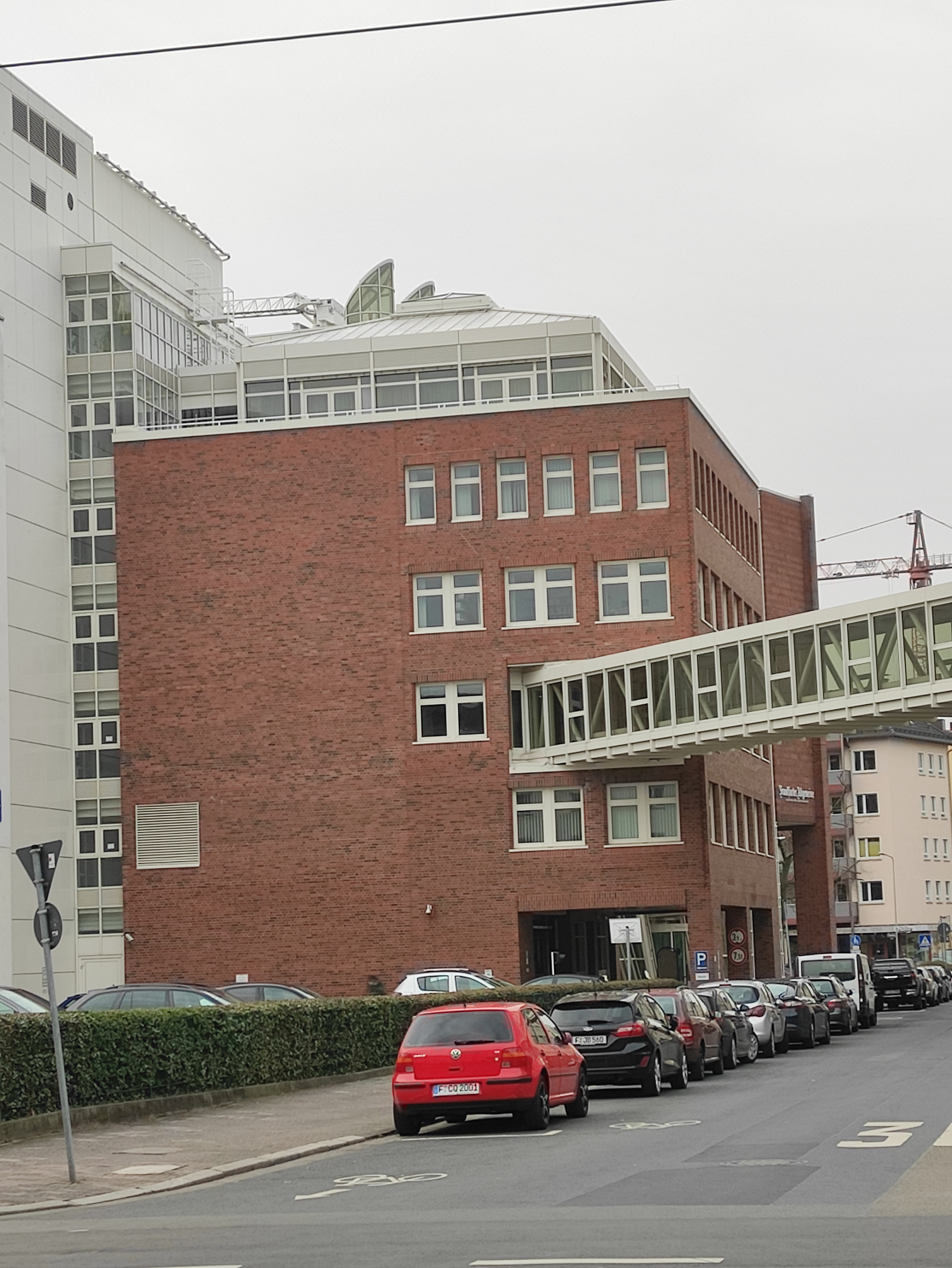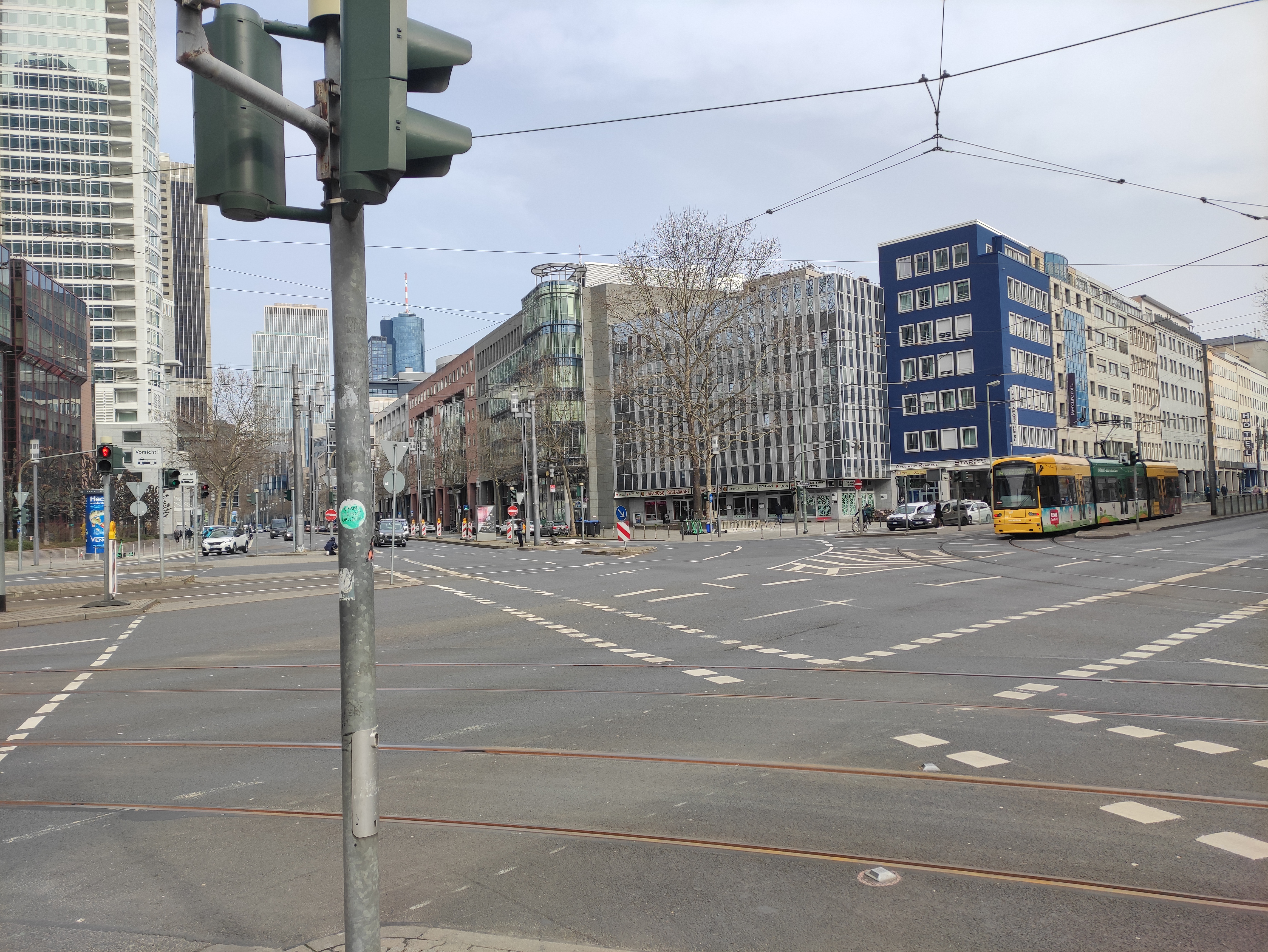 Südlich, in der Verlängerung der Moselstraße, ist der Holbeinsteg zu sehen, der vom Bahnhofsviertel zum Städel über den Main führt. Kurz Fluchtreflexe, vielleicht doch eher längs des Mains nach Hoechst zu spazieren. Aber ich blieb an dieser ungastlichen Straße. Nach wenigen Metern der „Platz der Republik“, eine riesige Kreuzung. Sinnbildlich für die Autorepublik Deutschland. Ich muss an den „Marktplatz“ in Offenbach denken, der ja auch alles andere ist als ein Marktplatz, sondern ebenfalls eine stark befahrene Kreuzung. Aber wenigstens wird die ja inzwischen umgebaut. Rechts, in der Düsseldorfer Straße, ist gut das alte Polizeipräsidium zu sehen, dass ebenfalls dem Tod geweiht ist. Vor vielen Jahren war ich mal drin. Ich arbeitete noch beim Suhrkamp Verlag und in diesem Gebäude fand die Buchmessenparty des Verlages statt. Es war sehr charmant.