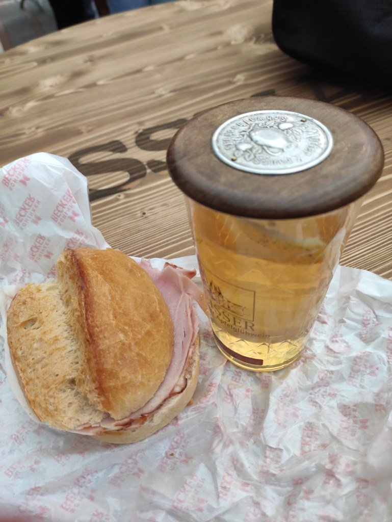 Der benachbarte Platz, an dem sonst der Bauer Stranz seine Buden aufbaut war ebenso leer, wie viele andere an diesem Donnerstag. Ich wusste also im ersten Moment nicht, wo ich was essen sollte und wo meinen Schoppen trinken. Also besorgte ich mir woanders eine Kartoffelbratwurst und steuerte einen weiteren Stand an, der heißen Apfelwein anbot. Beides war lecker.