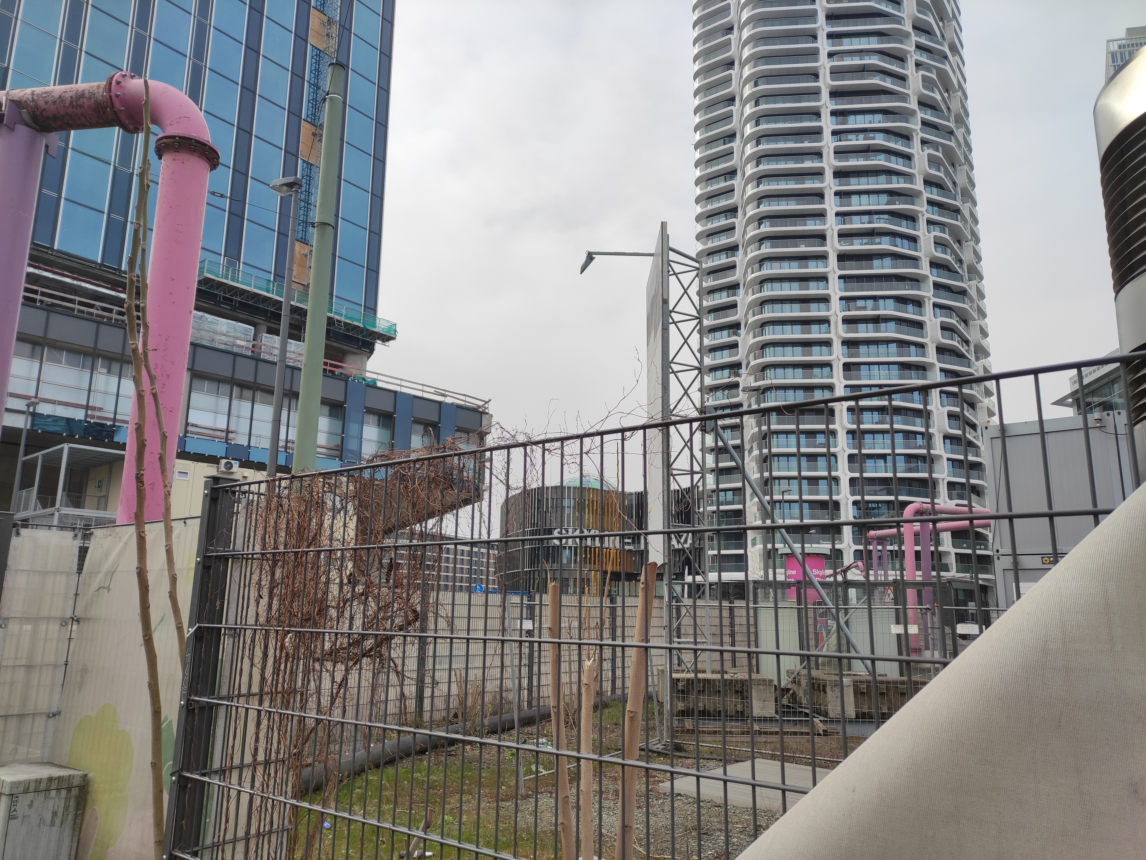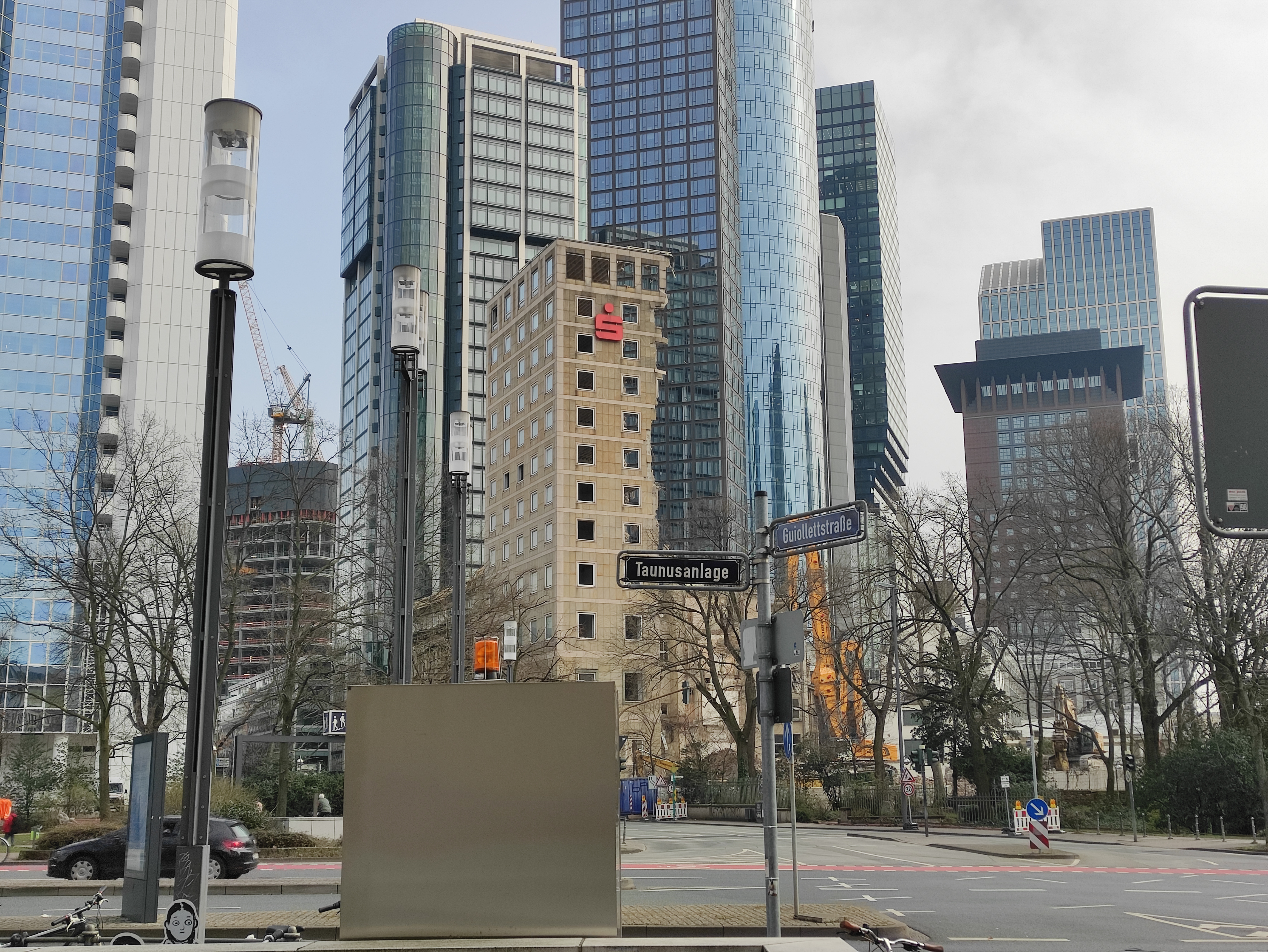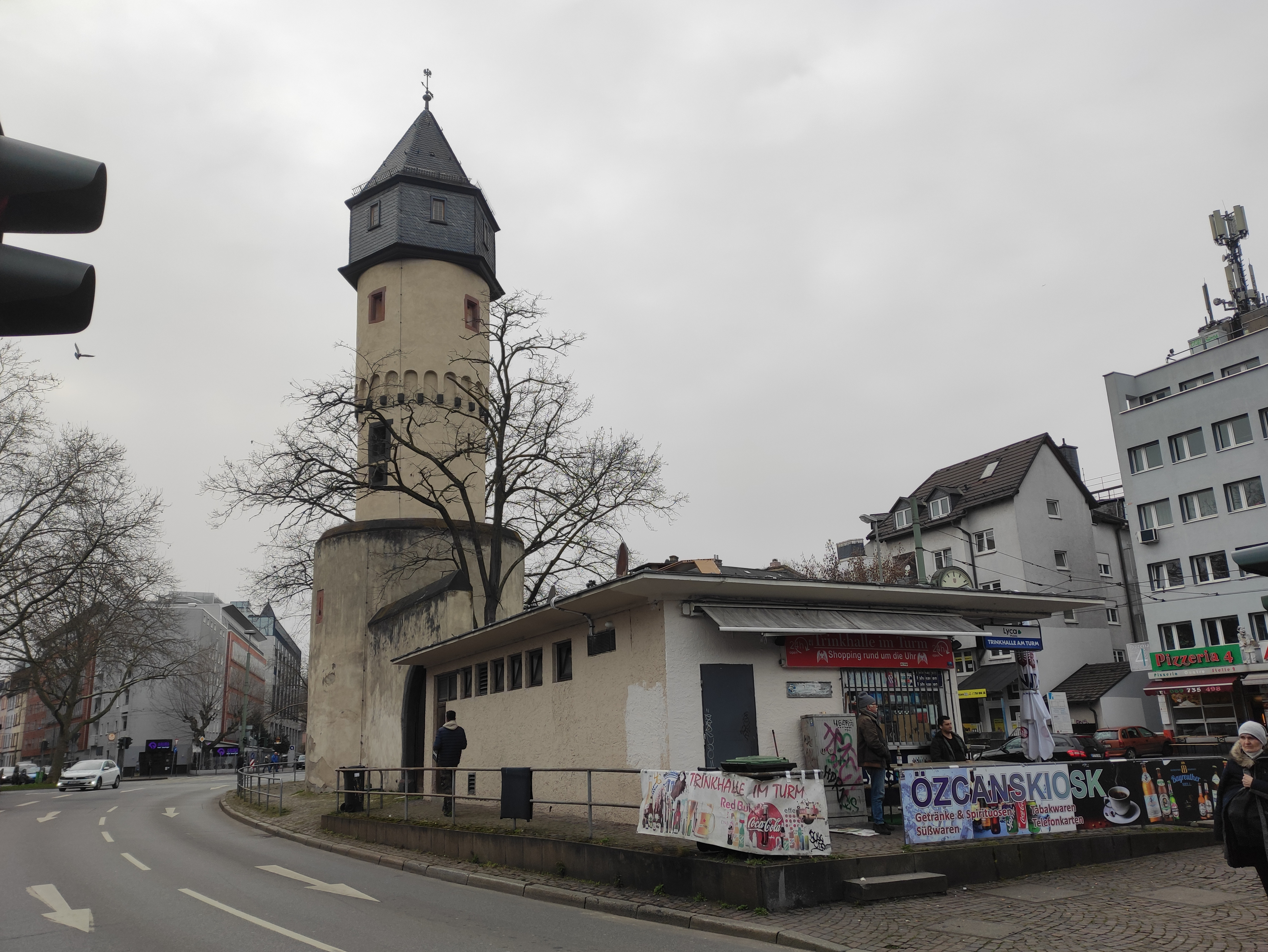 Ab diesem „Platz“ verändert sich die Mainzer, das Geldviertel endet hier. Weniger Bankentürme, weniger Glitzer, weniger edle Restaurants. Vorbei an Baustellen, von Norden ist das Skyline Plaza zu sehen, das Einkaufszentrum, das den Beginn des Europaviertels markiert (im Spaziergangstagebuch 6 das Thema). Gerne hätte ich im Café Ernst bei Kaffee und Kreppel pausiert, aber es war geschlossen. Also weiter, vielleicht ergab sich ja auf dem weiteren Weg eine andere Gelegenheit. Rechterhand schweift der Blick ins Gallusviertel. Erneut Fluchtgedanken, ob ich nicht meinen Weg über die parallel führende Frankenallee weiterführen soll. Aber ich blieb der häßlichen Straße treu. Habe im Laufe der Jahre gelernt, dass Häßlichkeit zu einer Stadt gehört, mithin wichtig ist. Aber das wäre ein eigenes, wohl auch sehr interessantes Thema, dass mir bereits länger im Kopf rumspukt. An Baustellen vorbei geht es weiter. Der Baukran ist das wahre Wahrzeichen Frankfurts, so ähnlich hatte es Mark-Stefan Tietze bereits 2014 in den Frankfurter Wegsehenswürdigkeiten formuliert. Das Gebäude der FAZ mit seiner Klinkerfassade folgt, bald auch die Galluswarte, natürlich mit Wasserhäuschen. Sie kann einem leid tun, auf ihrer engen, vom steten Autoverkehr umnebelten Verkehrsinsel. Ähnlich einem Leuchtturm, der Sturm und Wellen trotzt. Einige Unentwegte stehen trotzdem da und trinken ihr Binding.