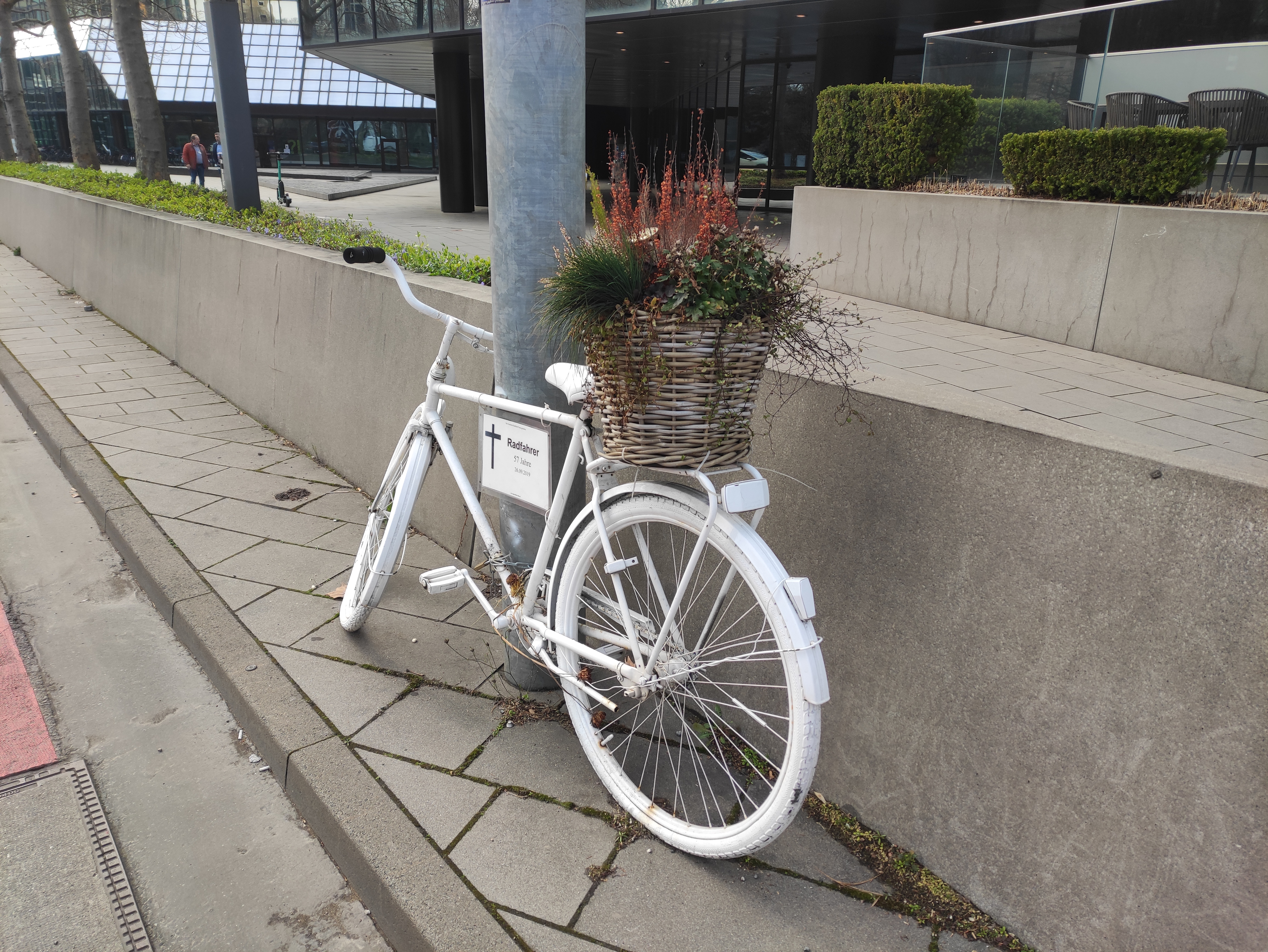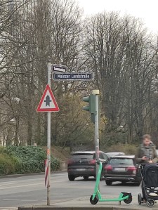 An der Kreuzung Höhen- und Berger Straße wurde im letzten Jahr eine Fußgängerin von einem Baustellenfahrzeug überfahren und tödlich verletzt. Der LKW war entgegen der Einbahnstraße zur Kreuzung gefahren und rechts in die Höhenstraße abgebogen. Das Opfer wollte bei Grün die Straße überqueren. Bis heute erinnern Blumen und Kerzen an den grausamen Unfall. Gegenüber der Unfallstelle wird jetzt ein seit Ewigkeiten brach liegendes Gelände bebaut. Der Entwurf des Hauses, der dort hängt, macht auf mich einen guten Eindruck. Es wird sich erfreulich von der heute so verbreiteten „Würfelhustenarchitektur“ unterscheiden. Warten wir ab, wie es in der Realität wirkt.