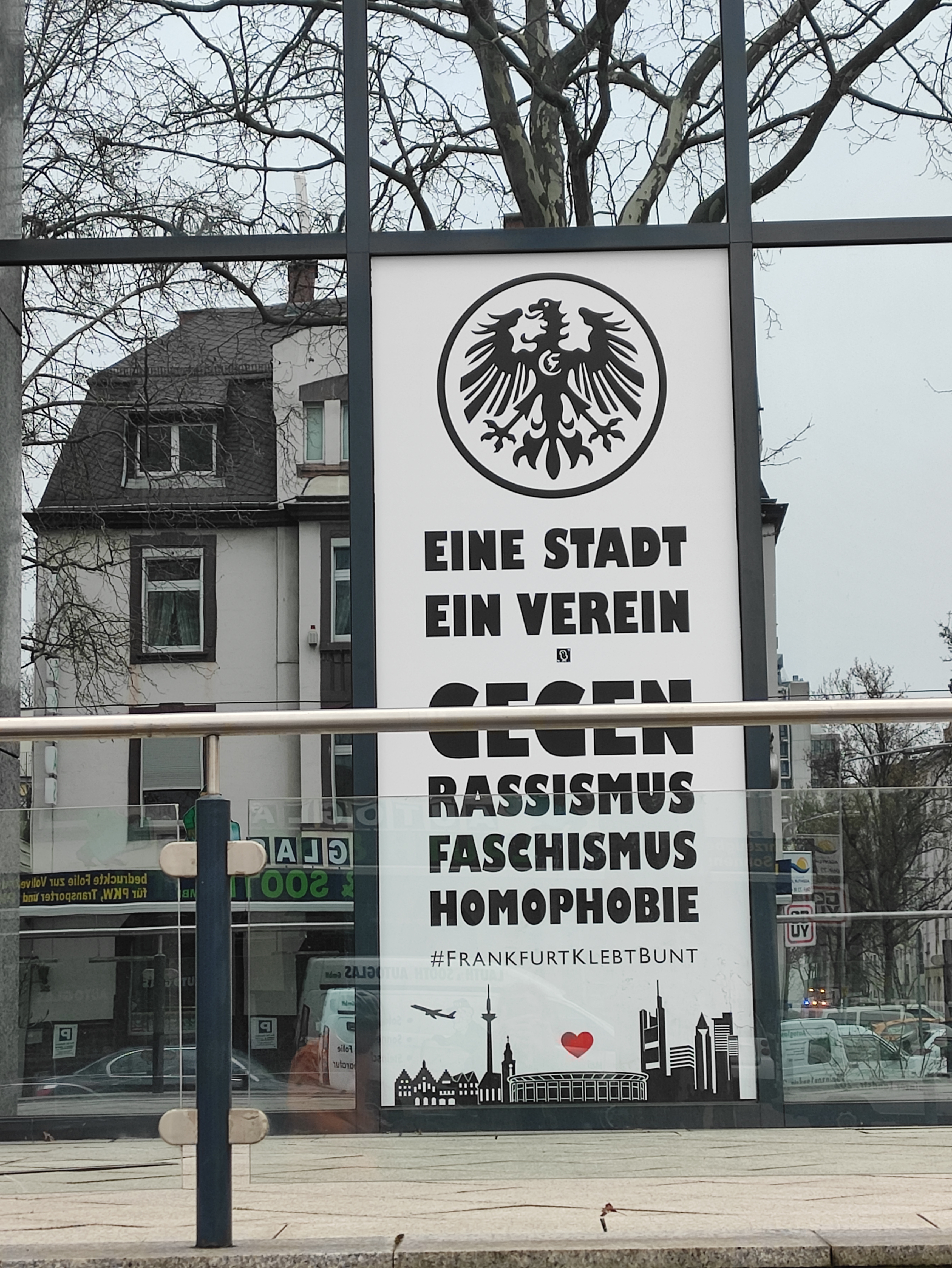 Folgen wir unserer Straße weiter nach Westen. Autoglas Reifen 24, Dream Haar Studio (ohne Termin), Sportsbar, Döner, Chinarestaurant, Mainzer Grill, Alinis Frischer Fisch und Fisch Imbiss, Pizzeria Prago, Main Chicken. Im Euro Jackpot locken 89 Mio Euro. Die Mainzer wird zur Ausfallstraße mit dem typischen Angebot. Und auch wieder ein Plakat, dass zeigt, weshalb ich froh bin, Fan dieses Vereins zu sein. Charakterlose Wohnriegel erinnern an das nahe Europaviertel. Linkerhand eine kleine Grünanlage, verziert mit einem überaus häßlichen Kunstwerk. „NICHTS BLEIBT WIE ES IST“; lautet die Inschrift. Ich wünsche es dem Klotz. Der Titel des Werks indes macht Hoffnung: „LIVING STONE“. Denn was lebt, stirbt auch.