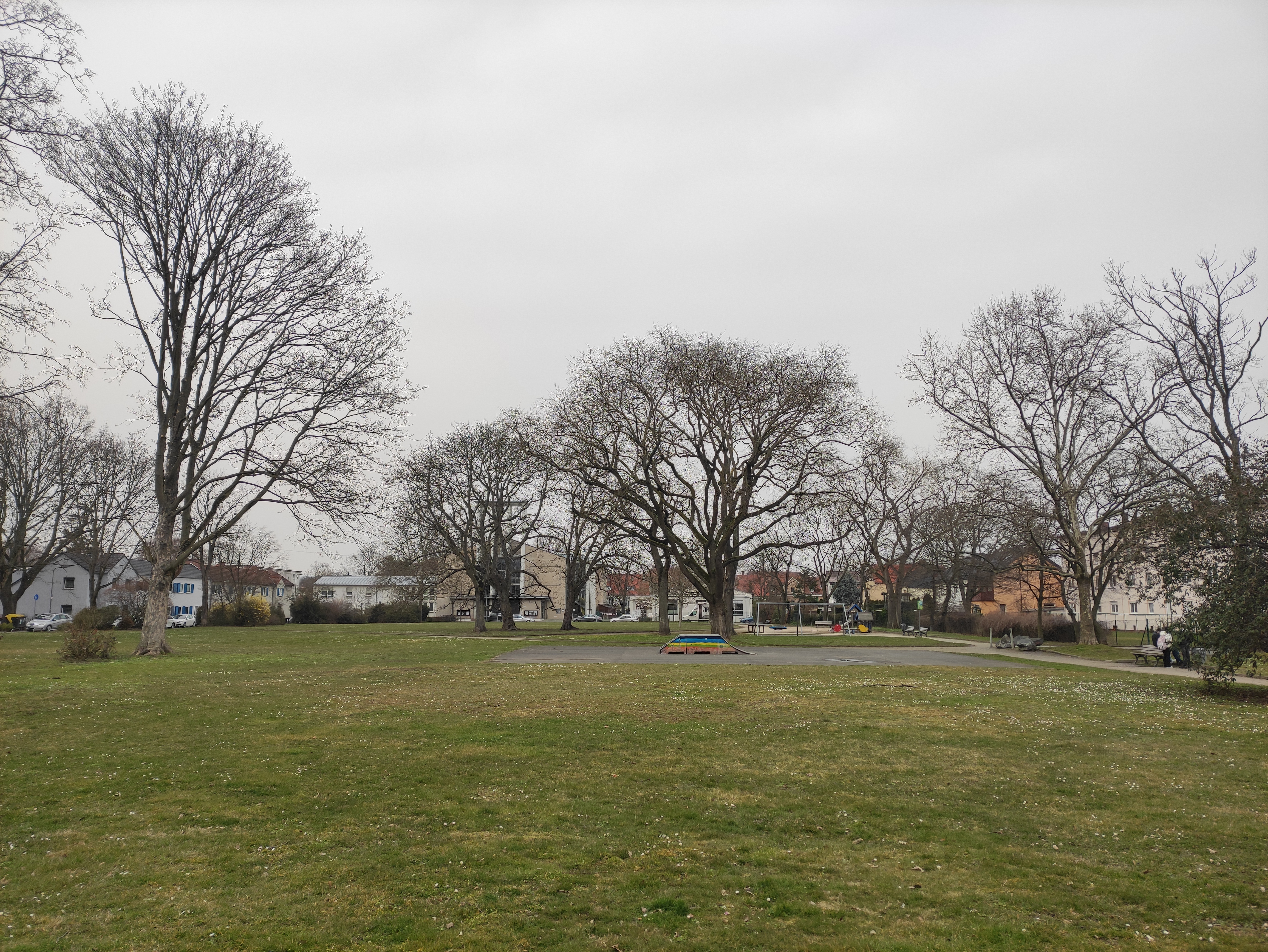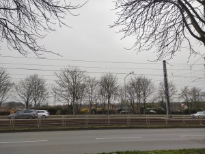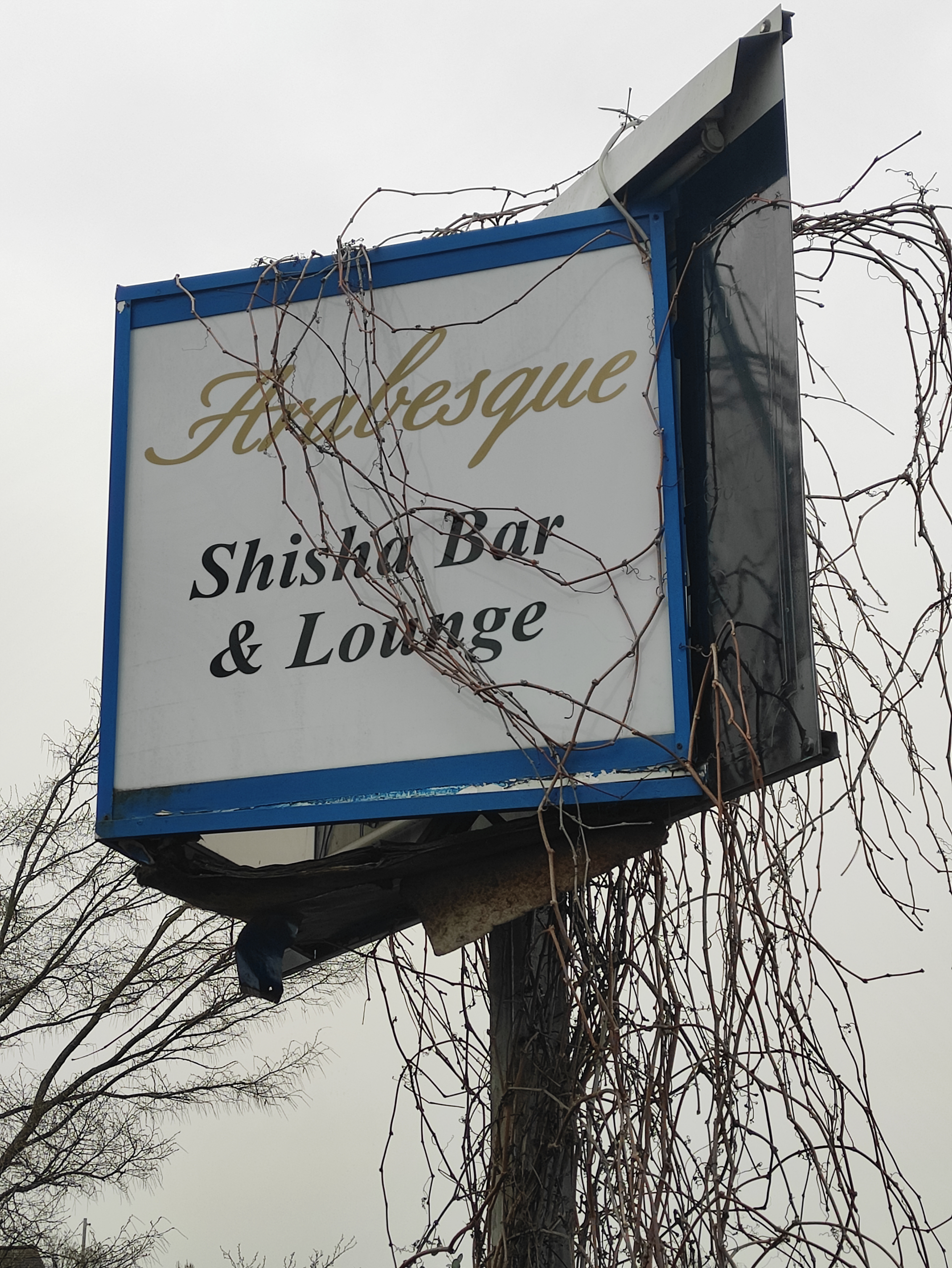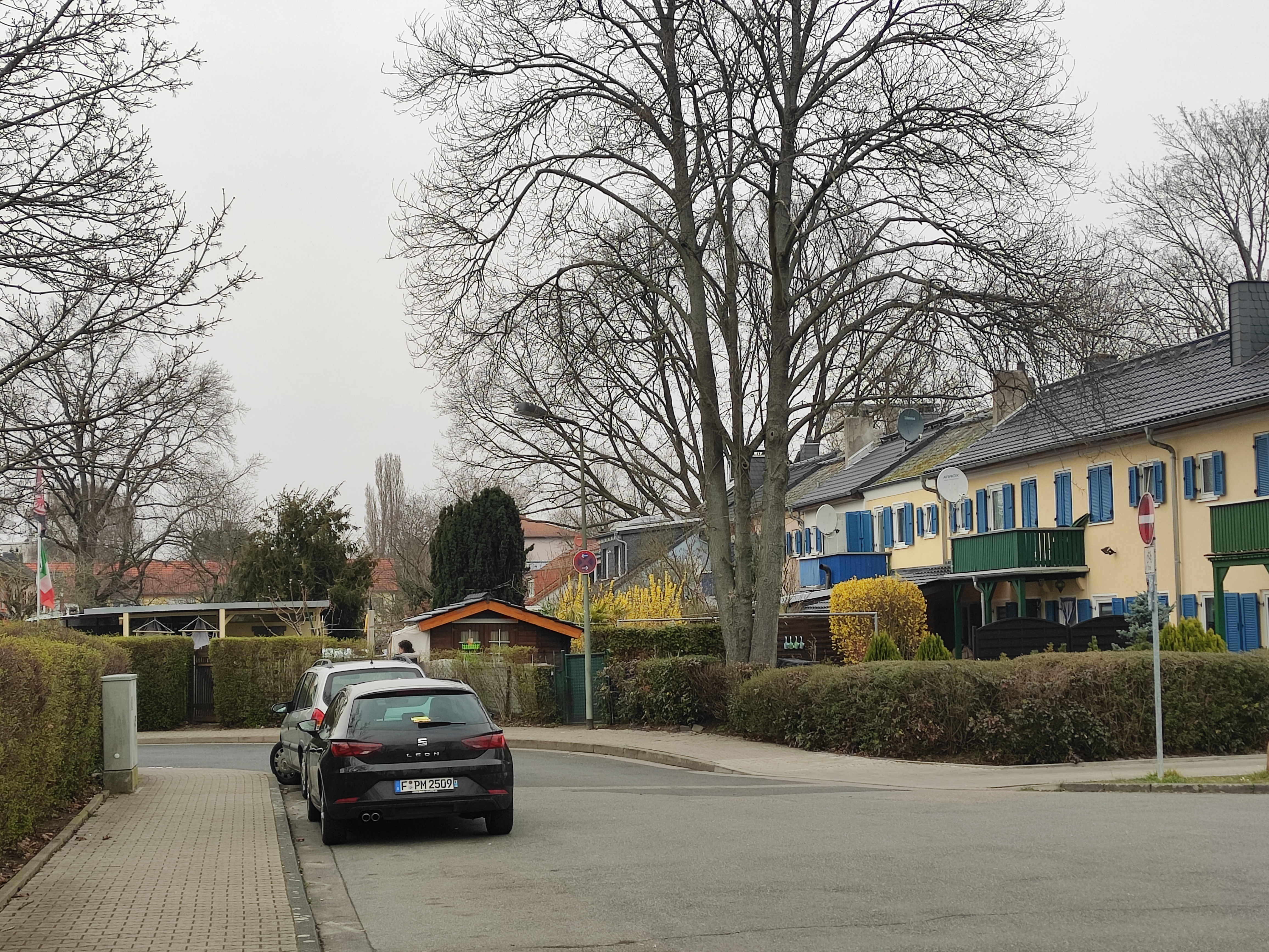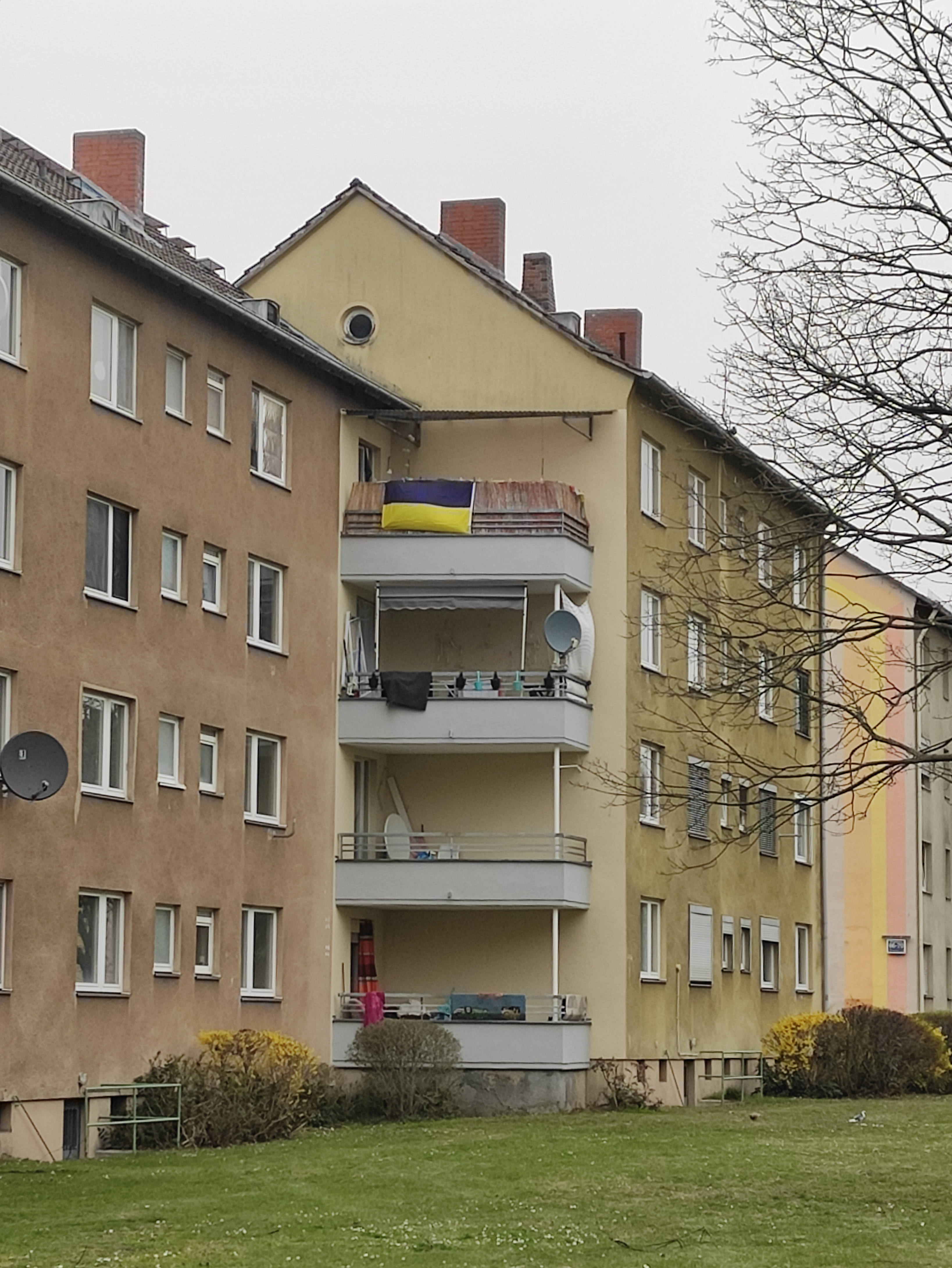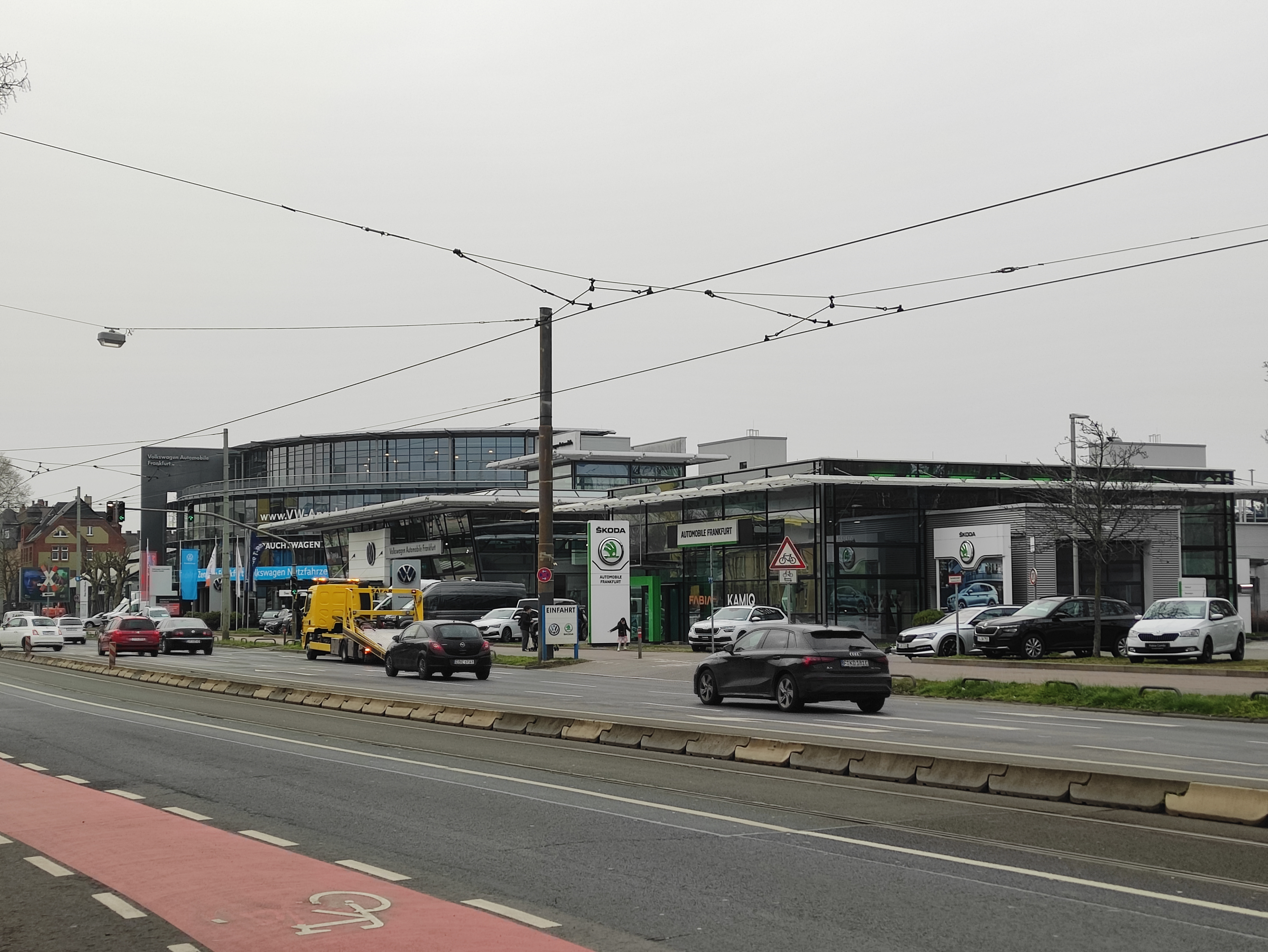 Überraschend plötzlich eine Reihe von Siedlungsbauten an der Schloßborner Straße. Alte Hellerhofsiedlung ist laut Wikipedia die korrekte Bezeichnung für diesen Ort. Sie wird in der Liste der Kulturdenkmäler des Gallus geführt. Ab hier wird die Mainzer wieder vierspurig. Ein Anwohner harkt, mit T-Shirt und Turnhose bekleidet, den Vorgarten des Mehrfamilienhauses. Ich friere beim Anblick. Weiter geht`s, Tankstellen, Waschanlagen, Burgerbuden, ein Baumarkt säumen meinen Weg. Die Straßenbahnhaltestelle Mönchhofstraße. Oft sehe ich diesen Namen, denn er prangt auf den Straßenbahnen der Linie 14, die am Ernst-May-Platz in Bornheim endet. Von dort fährt sie bis zur dieser ominösen Mönchhofstraße, der Endstation im Westen. Wo das wohl ist, habe ich mich immer gefragt. Jetzt weiß ich es und ich weiß auch, dass es nicht lohnt dort hin zu fahren. Aber ich bin die ganze Strecke der 14 abgelaufen und das macht mich ein kleines bißchen stolz. Hier hört die Stadt auf. Kleingärten mit Fähnchen von Fußballclubs und Heimatländern. Oft auch so zerfleddert, dass nichts mehr zu erkennen ist. In einer Kleingartenanlage eine Werbetafel für die Arabesque Shisha Bar & Lounge. Ich kann sie nirgends entdecken. An einem gesichtslosen Wohnblock die Ukrainische Flagge am Balkongeländer. Die Gegenwart ist überall.