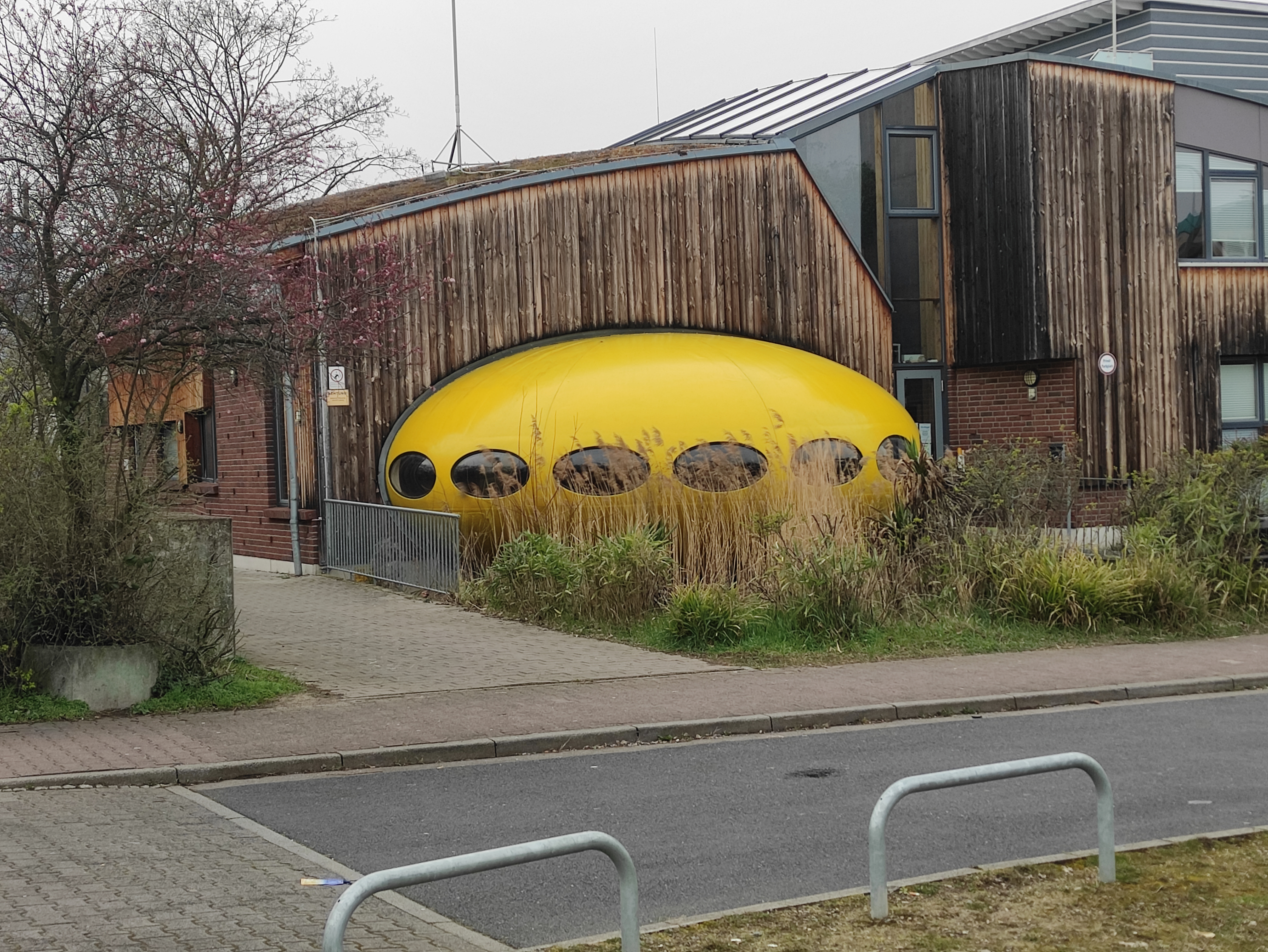 Plötzlich der Stadtteil Nied, ein Ort, den ich nur aus dem Zugfenster kenne. Ein-zwei Mal, als ich mit Kolleginnen und Kollegen als Staffel am Frankfurt Marathon teilgenommen habe – lange ist es her – war in Nied die Wechselstation, oder wie das hieß. Das war`s. Aber immerhin darf ich hier für ein paar hundert Meter der furchtbaren Straße entfliehen, denn sie ist durch einen Wall von dem Ort ein wenig abgetrennt. Zu Hören natürlich immer noch, zu riechen auch. Aber es wird fast schon idyllisch. Als ich wieder auf die Mainzer treffe, werde ich von einem UFO begrüßt. Es gehört zum Jugendzentrum Nied.