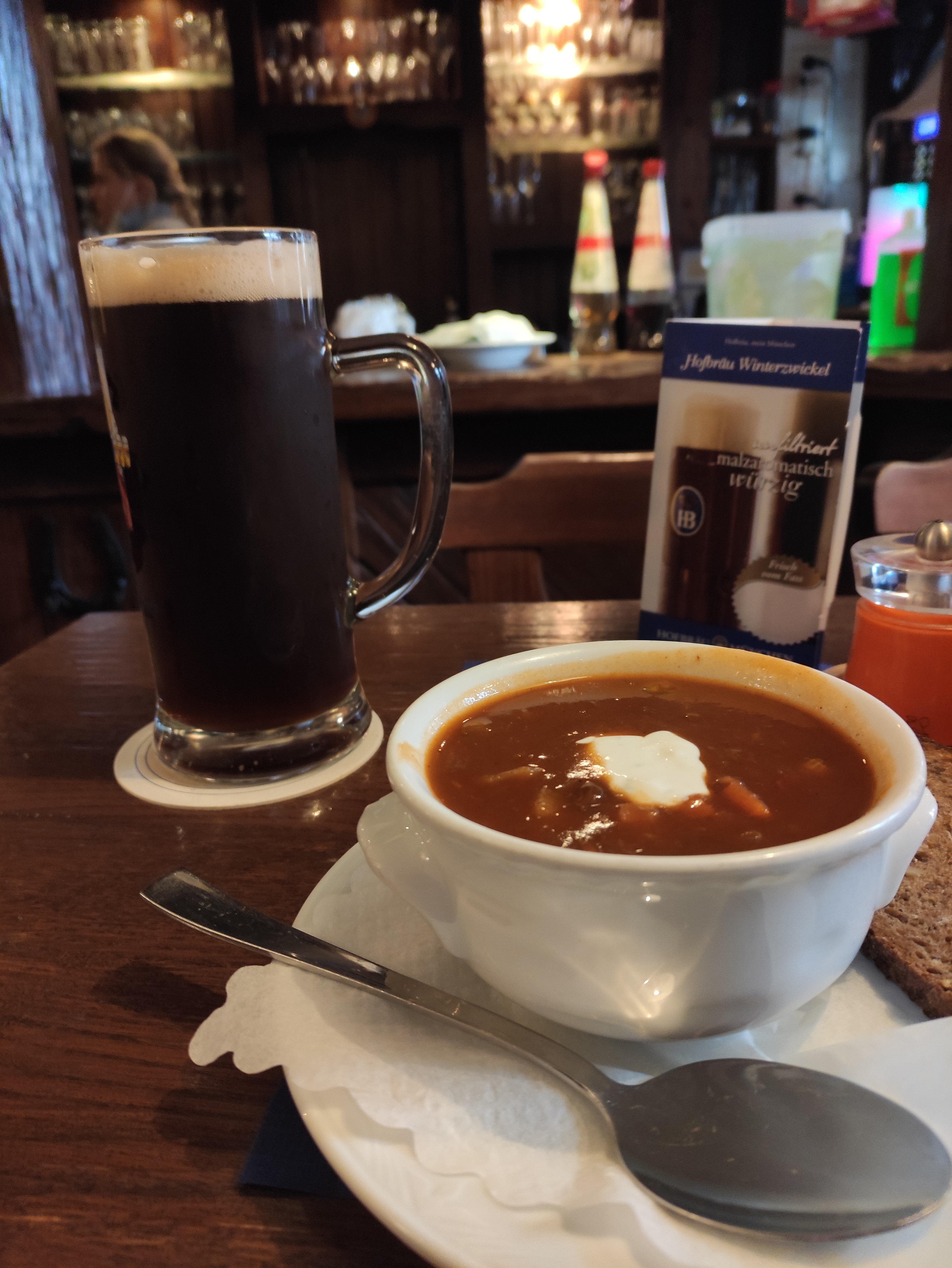 An der Kirche Nied lässt mich die Mainzer frei, ich darf zum Mainufer. Erleichterung und Aufatmen. Hoechst schon in Sichtweite. Es dauert nicht mehr lange. Bald das Schloss und der Schlossplatz. Ich habe mein Ziel erreicht. Hier ist es wirklich sehr schön. Ich kehre in eines der drei Wirtshäuser ein, finde einen Platz in Thekennähe und genieße das Zwickelbier vom Hofbräuhaus. Zur weiteren Stärkung bestelle ich eine Gulaschsuppe. Die erinnert allerdings an solche, die an Autobahnraststätten angeboten werden. Allerdings war ich schon seit Ewigkeiten an keiner Autobahnraststätte, vielleicht tue ich ihnen Unrecht. Aber wieso können die Leute in einem solchen Lokal ihre Suppe nicht selbst zubereiten? Naja, das Bier hat entschädigt.