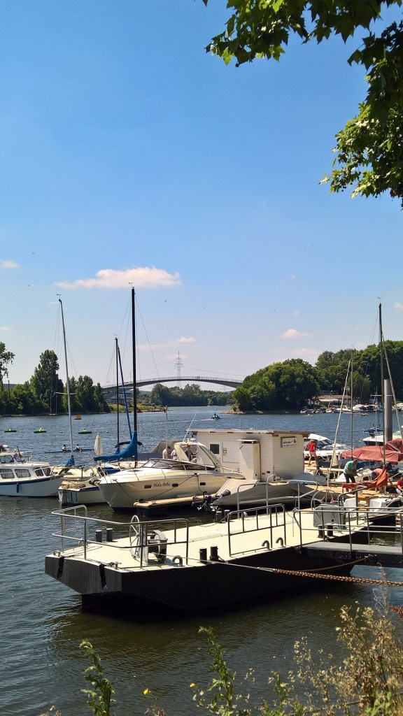 An der Schiersteiner Brücke werden wir vom Fluss weggezwungen. Die marode Brücke wird seit über zwei Jahren instandgesetzt. Der Uferweg ist versperrt. Zwischen zwei Wohncontainern huscht ein Bauarbeiter in Unterhose mit Rasierschaum ums Kinn über das staubige Areal. Vor den Containern Campingmöbel und ein Grill. Nach kurzem Umweg geht es weiter am Rheinufer. In einem Seitenarm bei Schierstein liegen zahlreiche Boote und Jachten. Am anderen Ende der Bucht paddeln Jugendliche in Kanus und Kajaks um die Wette, ein Regattafest. Am Ufer einige Stände. Wir machen bei Kaffee und selbstgebackenem Kuchen, zusammen für zwei Euro, eine Pause und schauen dem Treiben auf dem Wasser zu. Ein Büchertisch des örtlichen Unterstützervereins der Stadtbibliothek, den „Leseratten“ bietet eine Menge gebrauchter Taschenbücher für einen Euro an. Ich entdecke nichts, was mich interessiert hätte. J. und ich sind uns einig, dass wir Begriffe wie „Leseratte“ oder „Bücherwürmer“ nicht mögen, wobei sie ein gewisses Verständnis für „Bücherwurm“ aufbrachte. Ebenso einig sind wir in der Vermutung, dass wir wahrscheinlich ebenfalls paddeln würden, lebten wir in Schierstein oder irgendwo direkt an einem Fluss.