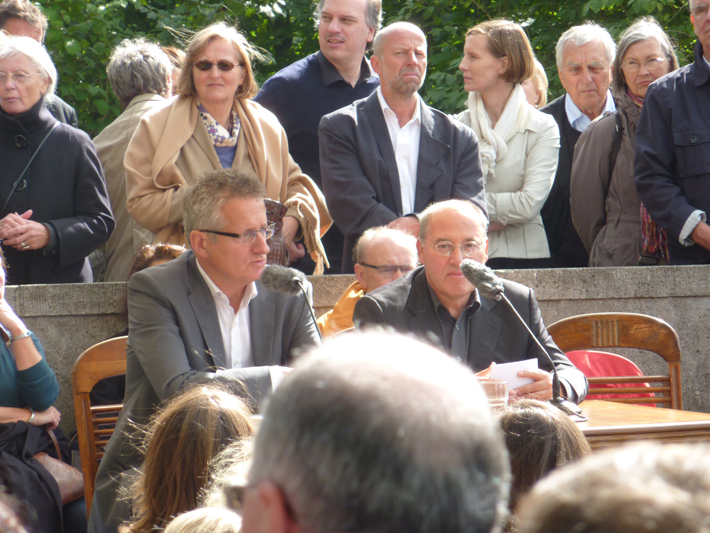 Thome hatte ich am Mittag zufällig am Stand der ARD gesehen. Ein Journalist, dessen Namen mir entfallen ist, sprach mit ihm über „Fliehkräfte“. Er beendete das Gespräch mit der Bemerkung, „Fliehkräfte“ sei ein „schöner, kleiner Roman“. Das trieb Thome, angesichts der 470 Seiten seines Romans, ein entsetztes Lächeln ins Gesicht. Als der ARD Mann sich korrigierte, liefen die Kameras bereits nicht mehr.